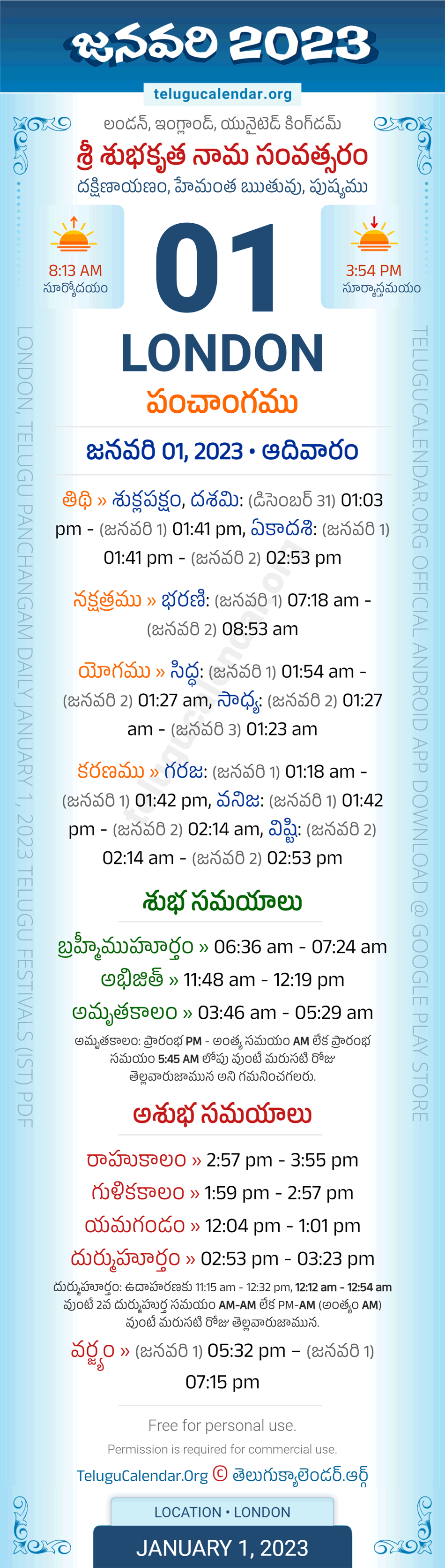 Download » January 1, 2023 » London (UK) Telugu Panchangam Daily Sheet with Auspicious and Inauspicious Timings.