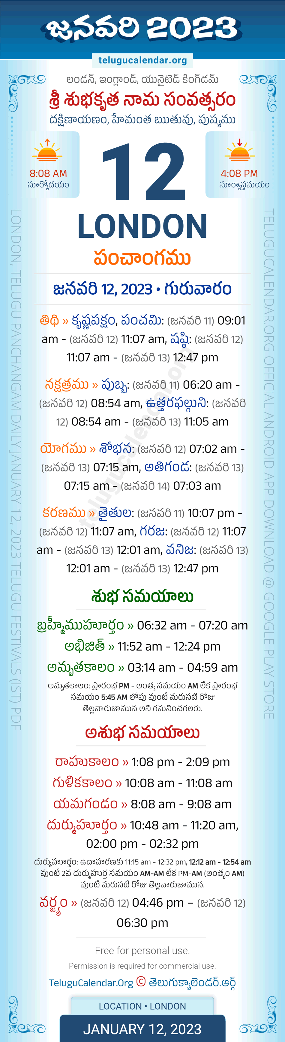 Download » January 12, 2023 » London (UK) Telugu Panchangam Daily Sheet with Auspicious and Inauspicious Timings.