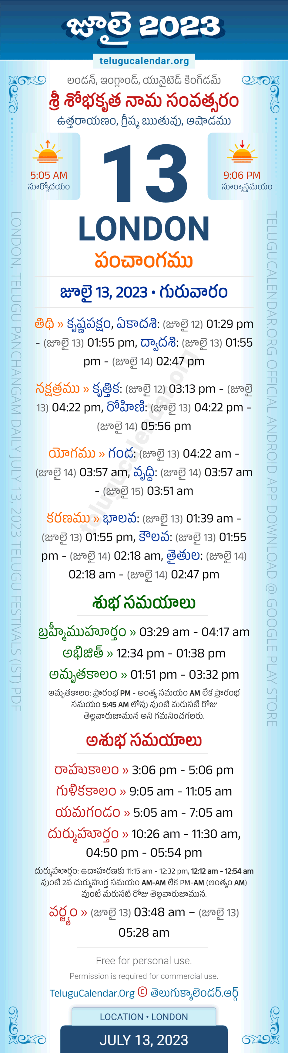 London Panchangam July 13, 2023 Daily Sheet in Telugu... London Telugu Panchangam Thursday, July 13, 2023, Today's London Tithi: Krishna Paksham, Ekadashi: (Jul 12) 01:29 pm - (Jul 13) 01:55 pm, Dwadasi: (Jul 13) 01:55 pm - (Jul 14) 02:47 pm, Today's London Nakshatram: Krithika: (Jul 12) 03:13 pm - (Jul 13) 04:22 pm, Krithika: (Jul 13) 04:22 pm - (Jul 14) 05:56 pm, Telugu Year: Sri Sobhakritu Nama Samvatsaram, Vedic Aayana: Uttarayanam, Vedic Rutuvu: Grishma, Chandramasa (Amanta): Ashadhamu. Below image showing information about the 5 attributes of the day, viz., Varam, Tithi, Nakshatram, Yogam & Karanam along with starting and end timings. Read more