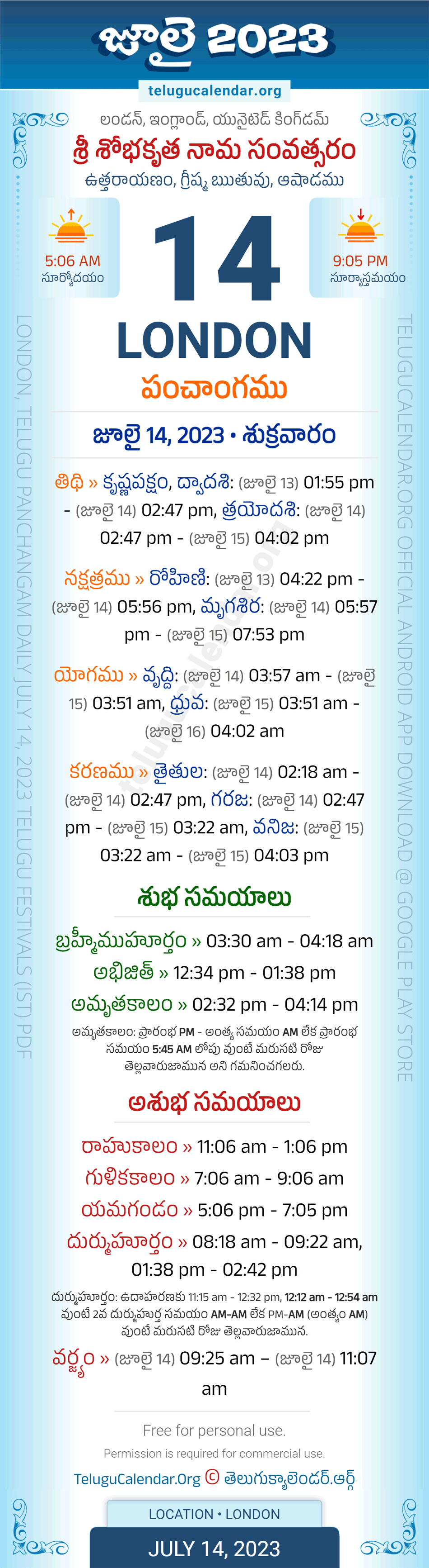 Download » July 14, 2023 » London (UK) Telugu Panchangam Daily Sheet with Auspicious and Inauspicious Timings.