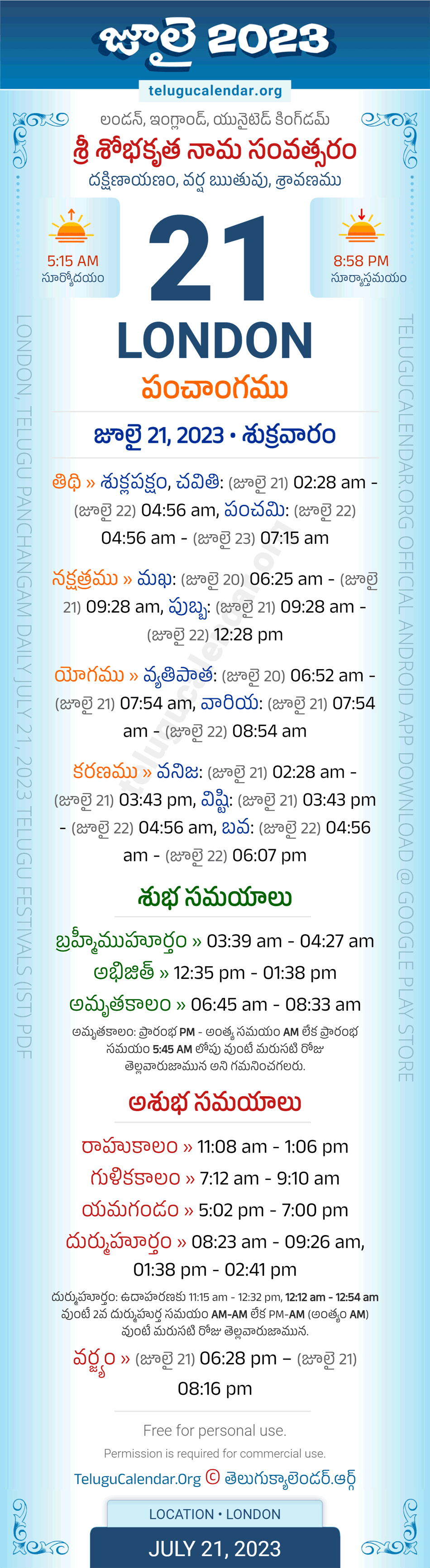 London Panchangam July 21, 2023 Daily Sheet in Telugu... London Telugu Panchangam Friday, July 21, 2023, Today's London Tithi: Sukla Paksham, Chavithi: (Jul 21) 02:28 am - (Jul 22) 04:56 am, Panchami: (Jul 22) 04:56 am - (Jul 23) 07:15 am, Today's London Nakshatram: Makha: (Jul 20) 06:25 am - (Jul 21) 09:28 am, Purva Phalguni: (Jul 21) 09:28 am - (Jul 22) 12:28 pm, Telugu Year: Sri Sobhakritu Nama Samvatsaram, Vedic Aayana: Dakshinayanam, Vedic Rutuvu: Varsha, Chandramasa (Amanta): Sravanamu. Below image showing information about the 5 attributes of the day, viz., Varam, Tithi, Nakshatram, Yogam & Karanam along with starting and end timings. Read more