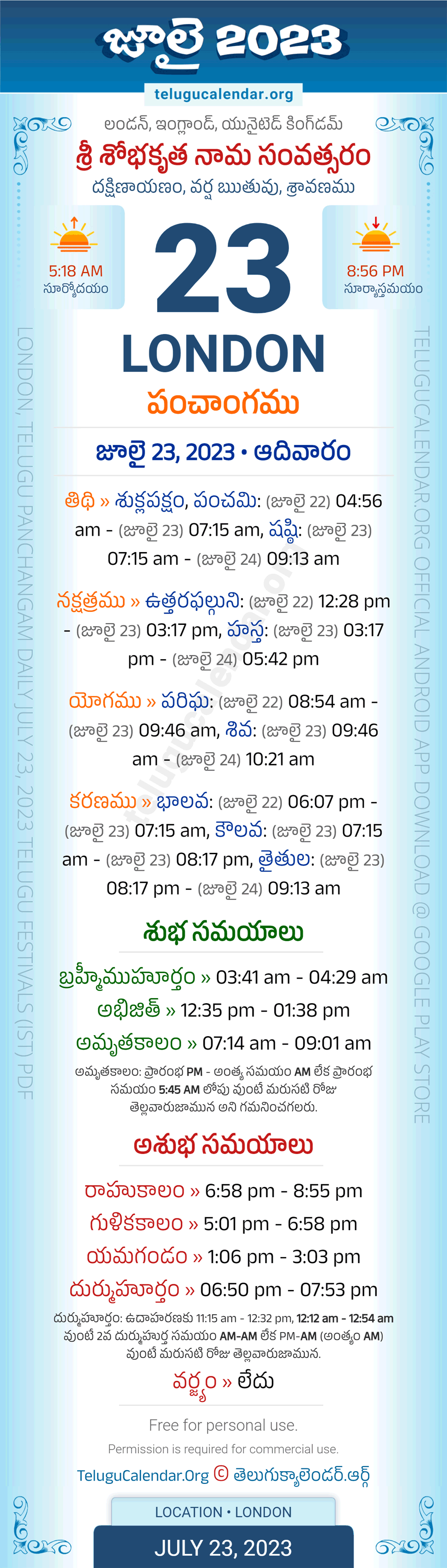 London Panchangam July 23, 2023 Daily Sheet in Telugu... London Telugu Panchangam Sunday, July 23, 2023, Today's London Tithi: Sukla Paksham, Panchami: (Jul 22) 04:56 am - (Jul 23) 07:15 am, Shashthi: (Jul 23) 07:15 am - (Jul 24) 09:13 am, Today's London Nakshatram: Uttara Phalguni: (Jul 22) 12:28 pm - (Jul 23) 03:17 pm, Hastha: (Jul 23) 03:17 pm - (Jul 24) 05:42 pm, Telugu Year: Sri Sobhakritu Nama Samvatsaram, Vedic Aayana: Dakshinayanam, Vedic Rutuvu: Varsha, Chandramasa (Amanta): Sravanamu. Below image showing information about the 5 attributes of the day, viz., Varam, Tithi, Nakshatram, Yogam & Karanam along with starting and end timings. Read more