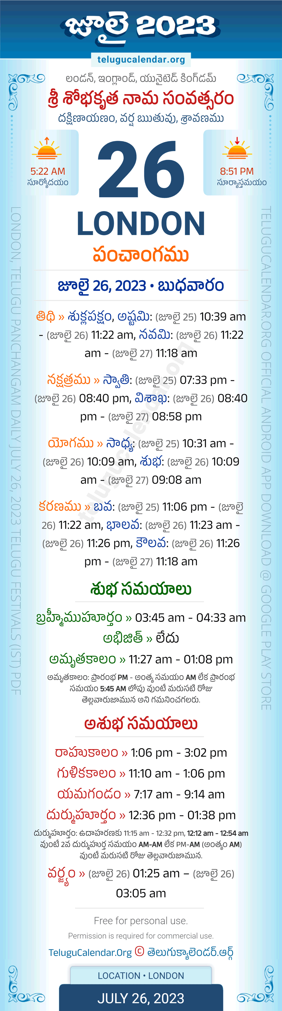 London Panchangam July 26, 2023 Daily Sheet in Telugu... London Telugu Panchangam Wednesday, July 26, 2023, Today's London Tithi: Sukla Paksham, Ashtami: (Jul 25) 10:39 am - (Jul 26) 11:22 am, Navami: (Jul 26) 11:22 am - (Jul 27) 11:18 am, Today's London Nakshatram: Swathi: (Jul 25) 07:33 pm - (Jul 26) 08:40 pm, Visakha: (Jul 26) 08:40 pm - (Jul 27) 08:58 pm, Telugu Year: Sri Sobhakritu Nama Samvatsaram, Vedic Aayana: Dakshinayanam, Vedic Rutuvu: Varsha, Chandramasa (Amanta): Sravanamu. Below image showing information about the 5 attributes of the day, viz., Varam, Tithi, Nakshatram, Yogam & Karanam along with starting and end timings. Read more