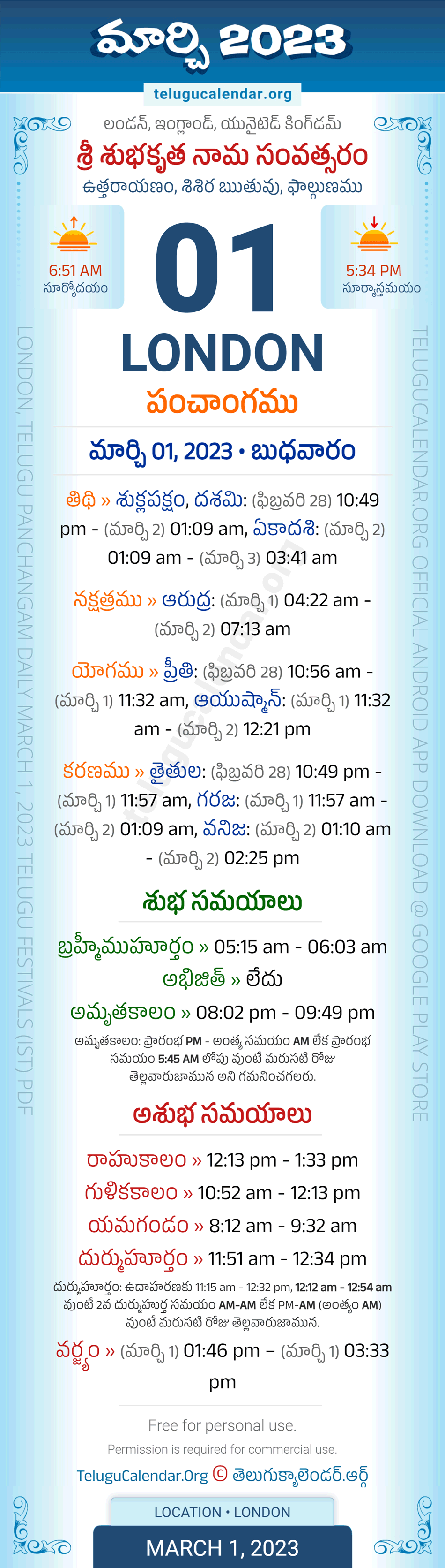 Download » March 1, 2023 » London (UK) Telugu Panchangam Daily Sheet with Auspicious and Inauspicious Timings.