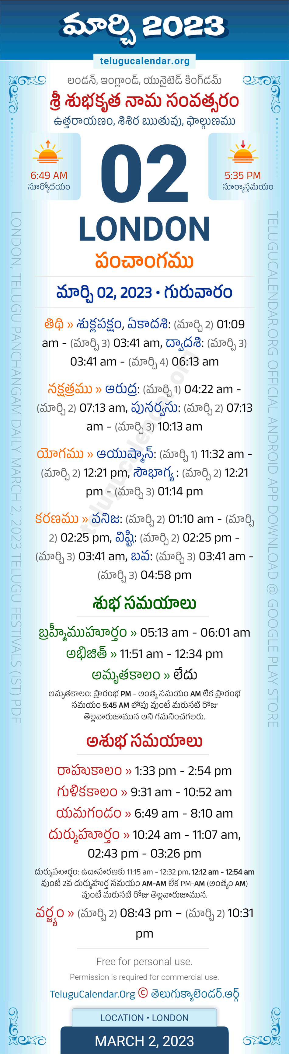 London Panchangam March 2, 2023 Daily Sheet in Telugu... London Telugu Panchangam Thursday, March 02, 2023, Today's London Tithi: Sukla Paksham, Ekadashi: (Mar 2) 01:09 am - (Mar 3) 03:41 am, Dwadasi: (Mar 3) 03:41 am - (Mar 4) 06:13 am, Today's London Nakshatram: Arudra: (Mar 1) 04:22 am - (Mar 2) 07:13 am, Punarvasu: (Mar 2) 07:13 am - (Mar 3) 10:13 am, Telugu Year: Sri Subhakritu Nama Samvatsaram, Vedic Aayana: Uttarayanam, Vedic Rutuvu: Shishira, Chandramasa (Amanta): Phalgunamu. Below image showing information about the 5 attributes of the day, viz., Varam, Tithi, Nakshatram, Yogam & Karanam along with starting and end timings. Read more