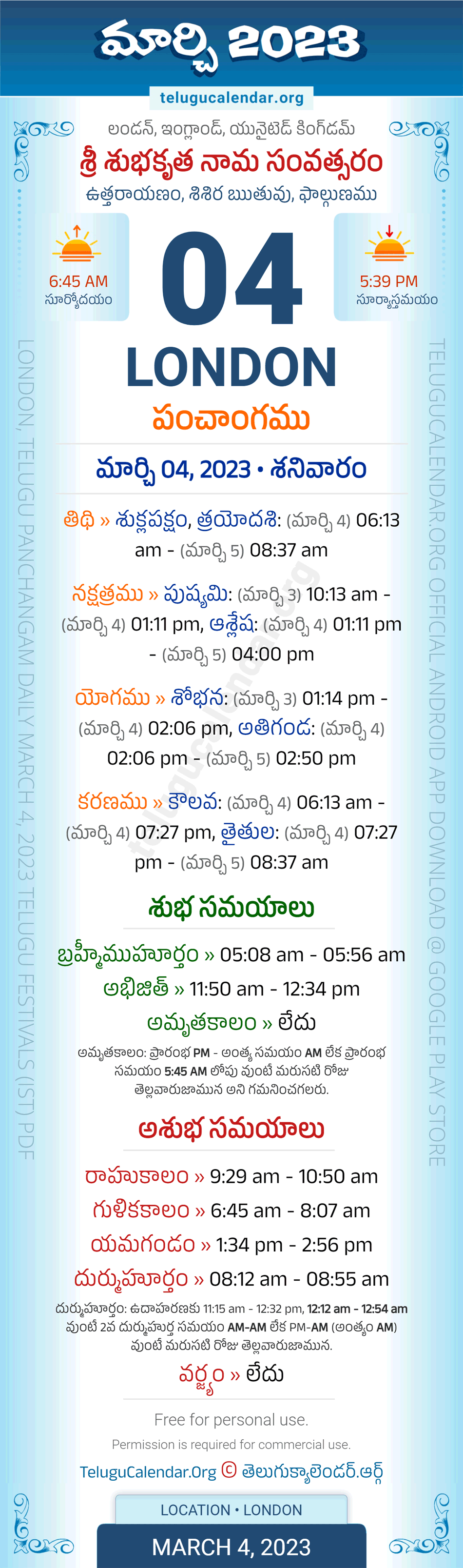 Download » March 4, 2023 » London (UK) Telugu Panchangam Daily Sheet with Auspicious and Inauspicious Timings.