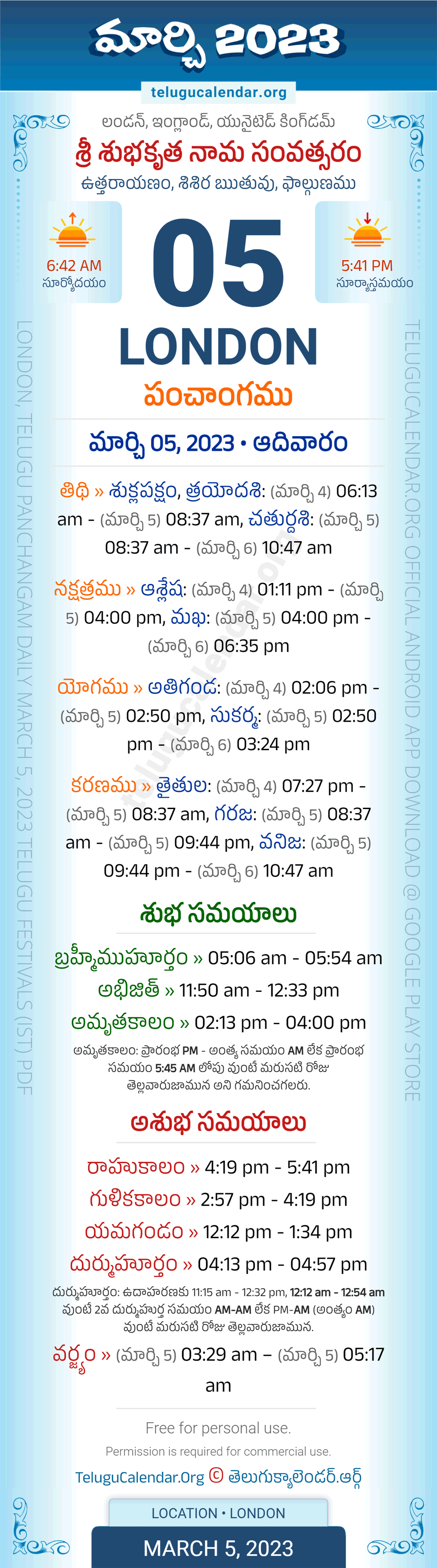 Download » March 5, 2023 » London (UK) Telugu Panchangam Daily Sheet with Auspicious and Inauspicious Timings.