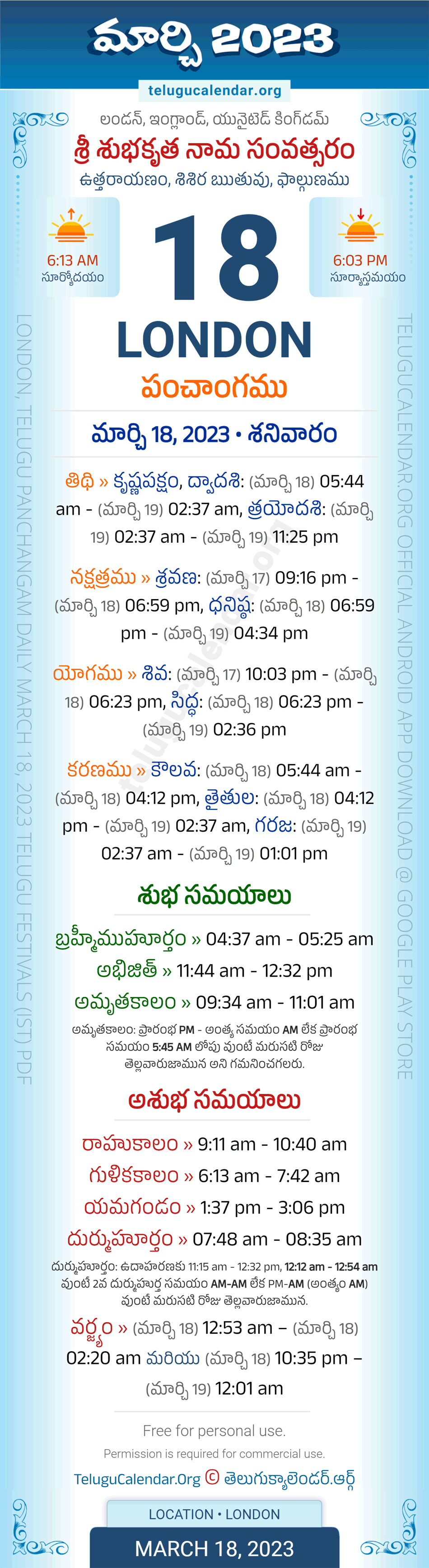 Download » March 18, 2023 » London (UK) Telugu Panchangam Daily Sheet with Auspicious and Inauspicious Timings.