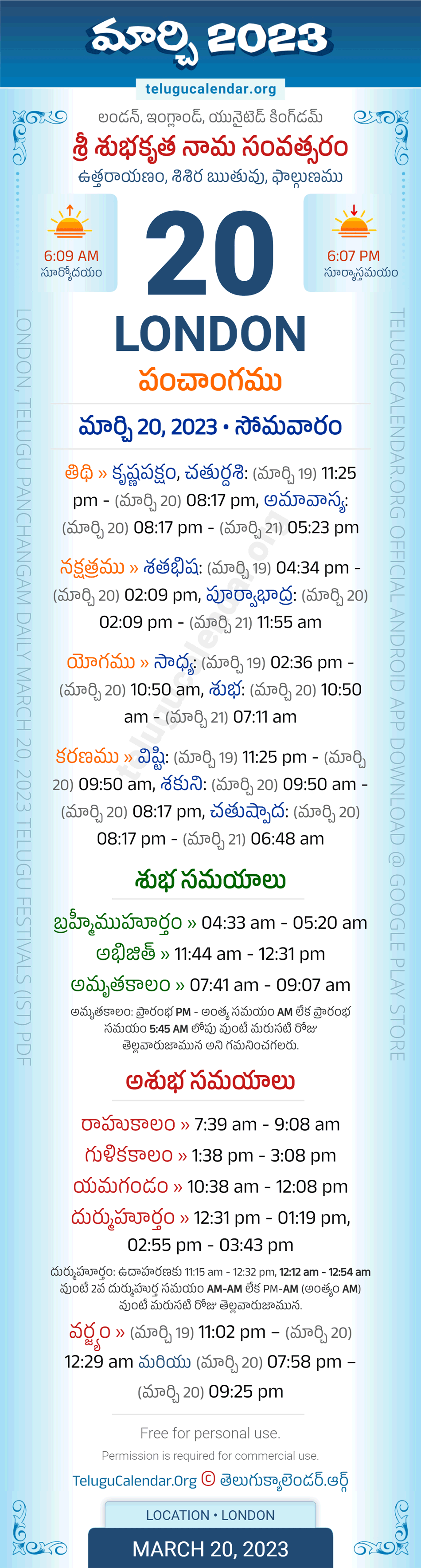London Panchangam March 20, 2023 Daily Sheet in Telugu... London Telugu Panchangam Monday, March 20, 2023, Today's London Tithi: Krishna Paksham, Chaturdashi: (Mar 19) 11:25 pm - (Mar 20) 08:17 pm, Amavasya: (Mar 20) 08:17 pm - (Mar 21) 05:23 pm, Today's London Nakshatram: Shathabhisha: (Mar 19) 04:34 pm - (Mar 20) 02:09 pm, Purva Bhadrapada: (Mar 20) 02:09 pm - (Mar 21) 11:55 am, Telugu Year: Sri Subhakritu Nama Samvatsaram, Vedic Aayana: Uttarayanam, Vedic Rutuvu: Shishira, Chandramasa (Amanta): Phalgunamu. Below image showing information about the 5 attributes of the day, viz., Varam, Tithi, Nakshatram, Yogam & Karanam along with starting and end timings. Read more