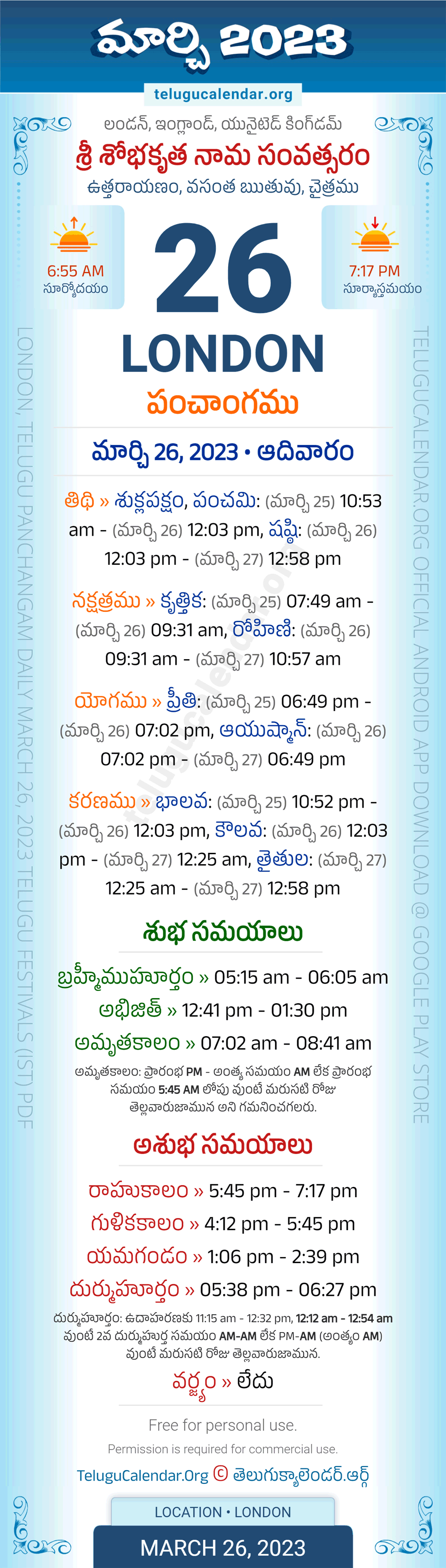 London Panchangam March 26, 2023 Daily Sheet in Telugu... London Telugu Panchangam Sunday, March 26, 2023, Today's London Tithi: Sukla Paksham, Panchami: (Mar 25) 10:53 am - (Mar 26) 12:03 pm, Shashthi: (Mar 26) 12:03 pm - (Mar 27) 12:58 pm, Today's London Nakshatram: Krithika: (Mar 25) 07:49 am - (Mar 26) 09:31 am, Krithika: (Mar 26) 09:31 am - (Mar 27) 10:57 am, Telugu Year: Sri Sobhakritu Nama Samvatsaram, Vedic Aayana: Uttarayanam, Vedic Rutuvu: Vasanta, Chandramasa (Amanta): Chaitramu. Below image showing information about the 5 attributes of the day, viz., Varam, Tithi, Nakshatram, Yogam & Karanam along with starting and end timings. Read more