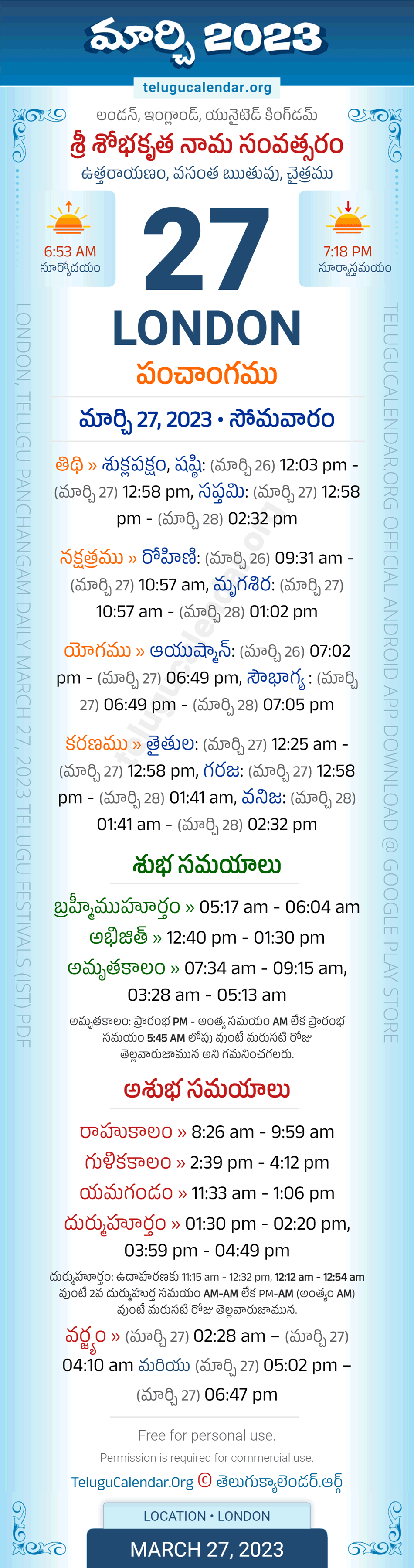 London Panchangam March 27, 2023 Daily Sheet in Telugu... London Telugu Panchangam Monday, March 27, 2023, Today's London Tithi: Sukla Paksham, Shashthi: (Mar 26) 12:03 pm - (Mar 27) 12:58 pm, Saptami: (Mar 27) 12:58 pm - (Mar 28) 02:32 pm, Today's London Nakshatram: Krithika: (Mar 26) 09:31 am - (Mar 27) 10:57 am, Mrigasira: (Mar 27) 10:57 am - (Mar 28) 01:02 pm, Telugu Year: Sri Sobhakritu Nama Samvatsaram, Vedic Aayana: Uttarayanam, Vedic Rutuvu: Vasanta, Chandramasa (Amanta): Chaitramu. Below image showing information about the 5 attributes of the day, viz., Varam, Tithi, Nakshatram, Yogam & Karanam along with starting and end timings. Read more