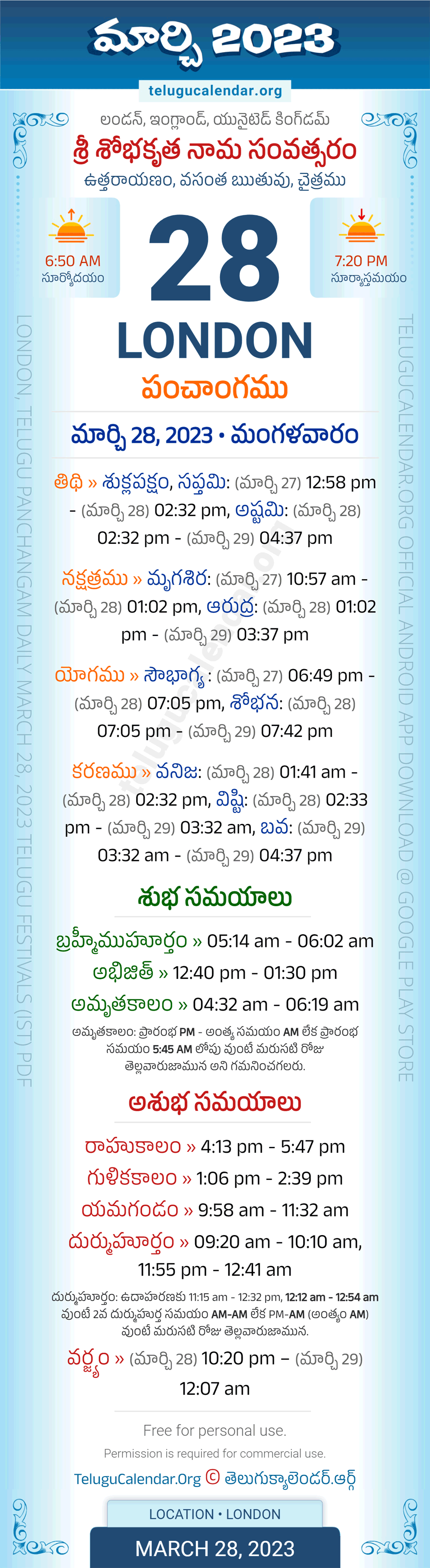 Download » March 28, 2023 » London (UK) Telugu Panchangam Daily Sheet with Auspicious and Inauspicious Timings.