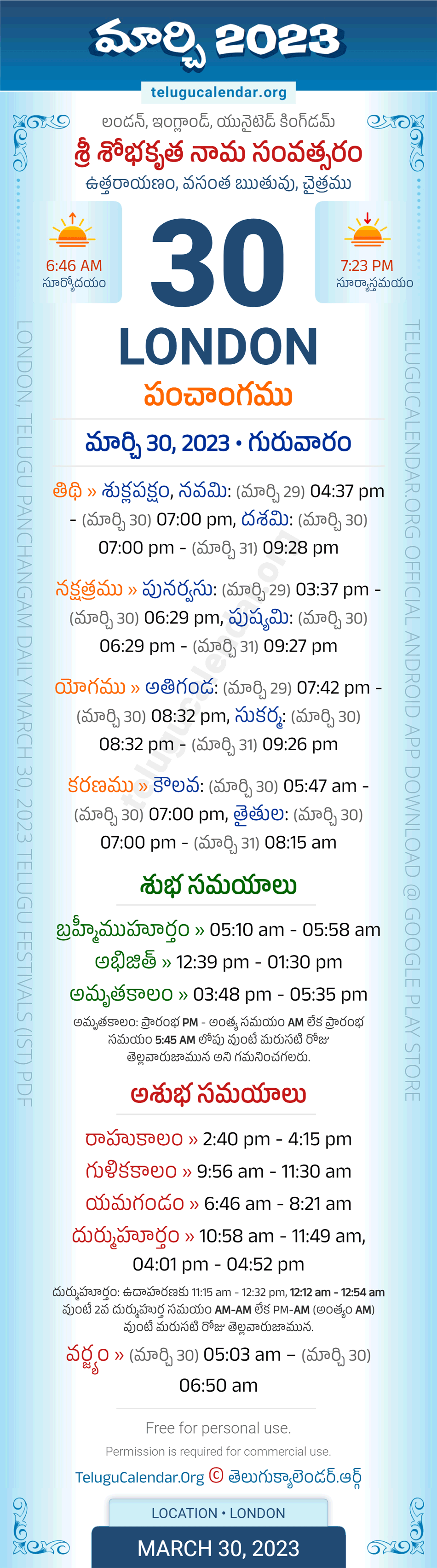 Download » March 30, 2023 » London (UK) Telugu Panchangam Daily Sheet with Auspicious and Inauspicious Timings.