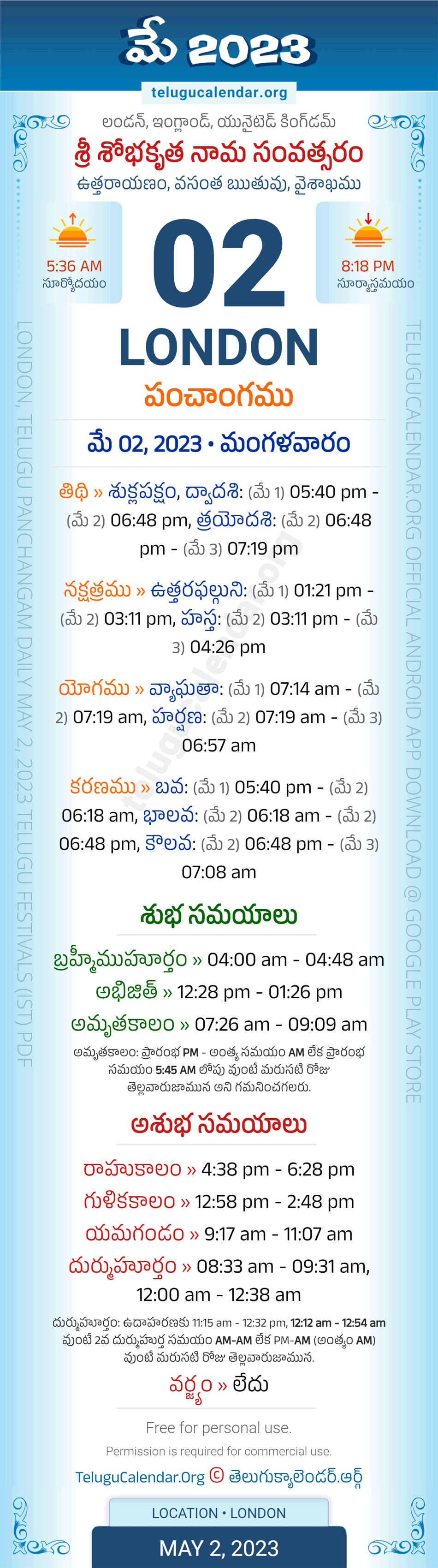Download » May 2, 2023 » London (UK) Telugu Panchangam Daily Sheet with Auspicious and Inauspicious Timings.