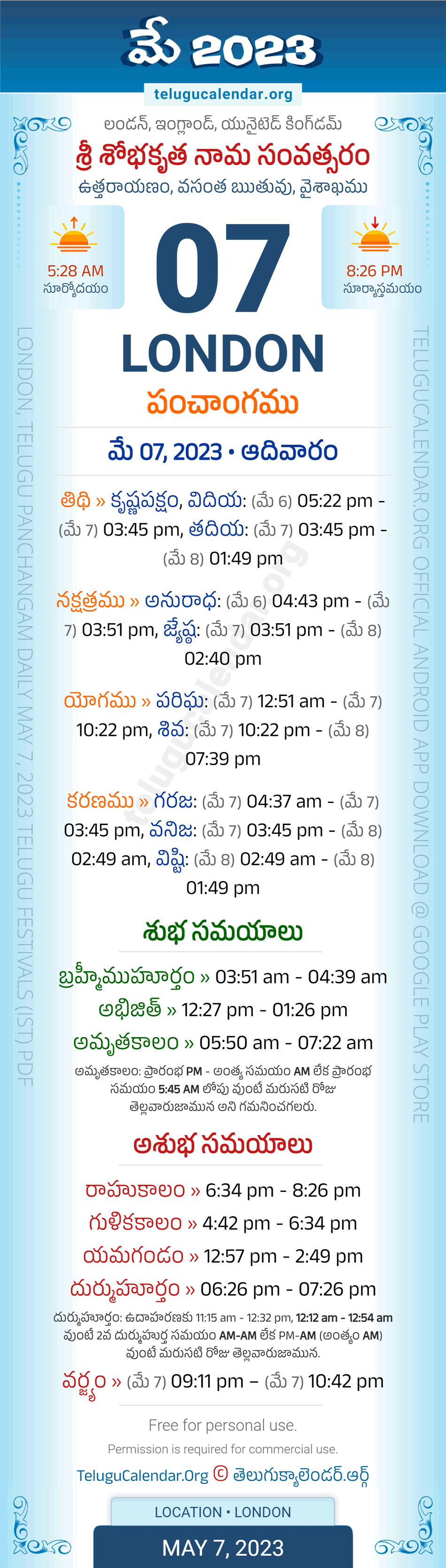 Download » May 7, 2023 » London (UK) Telugu Panchangam Daily Sheet with Auspicious and Inauspicious Timings.