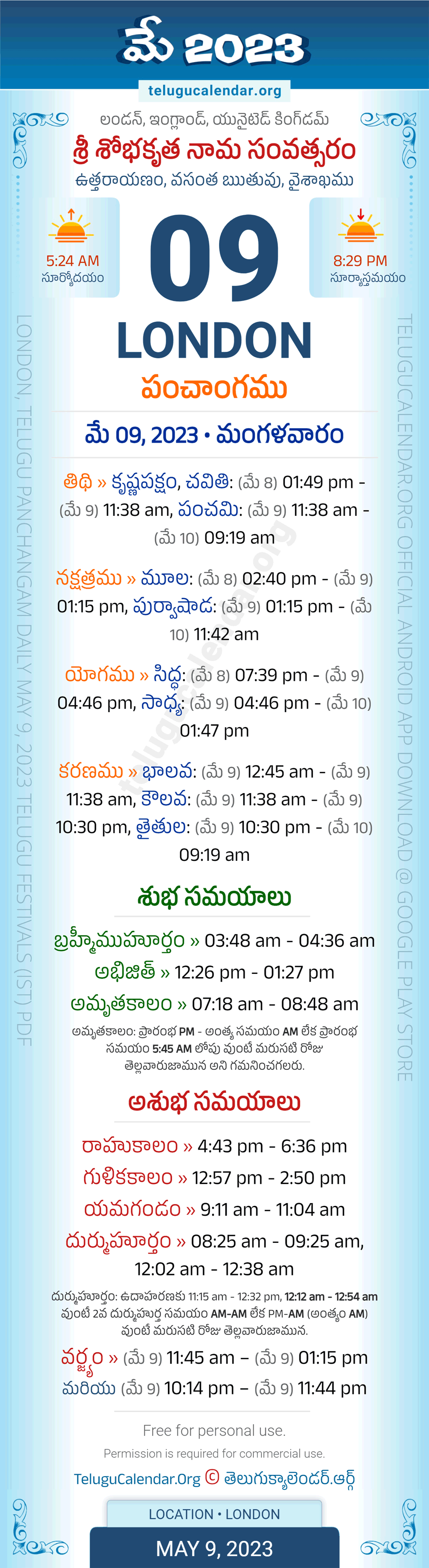 Download » May 9, 2023 » London (UK) Telugu Panchangam Daily Sheet with Auspicious and Inauspicious Timings.
