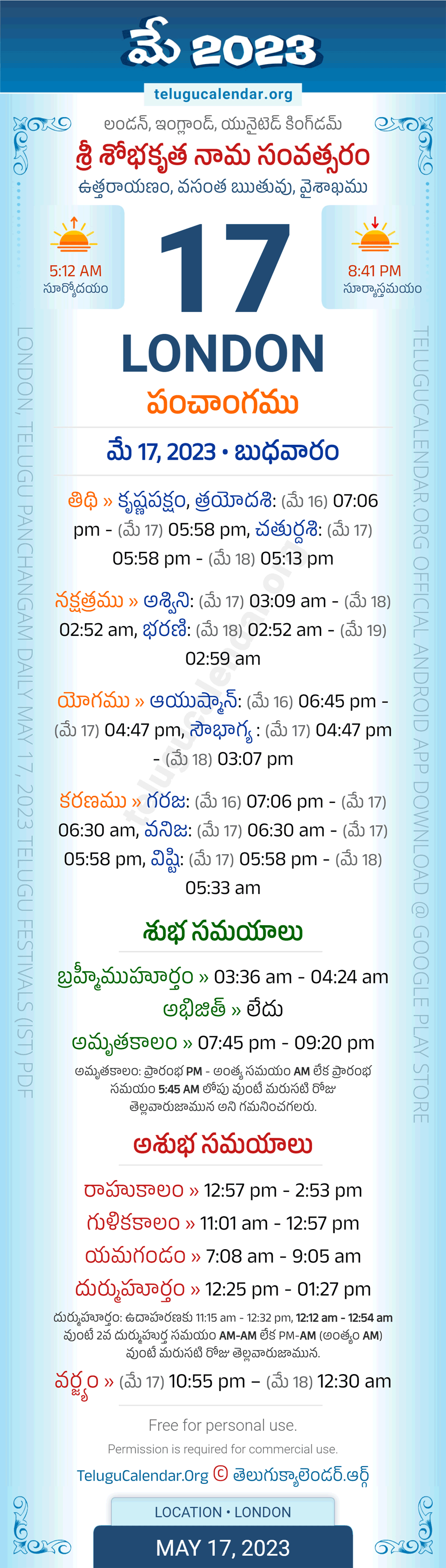 Download » May 17, 2023 » London (UK) Telugu Panchangam Daily Sheet with Auspicious and Inauspicious Timings.