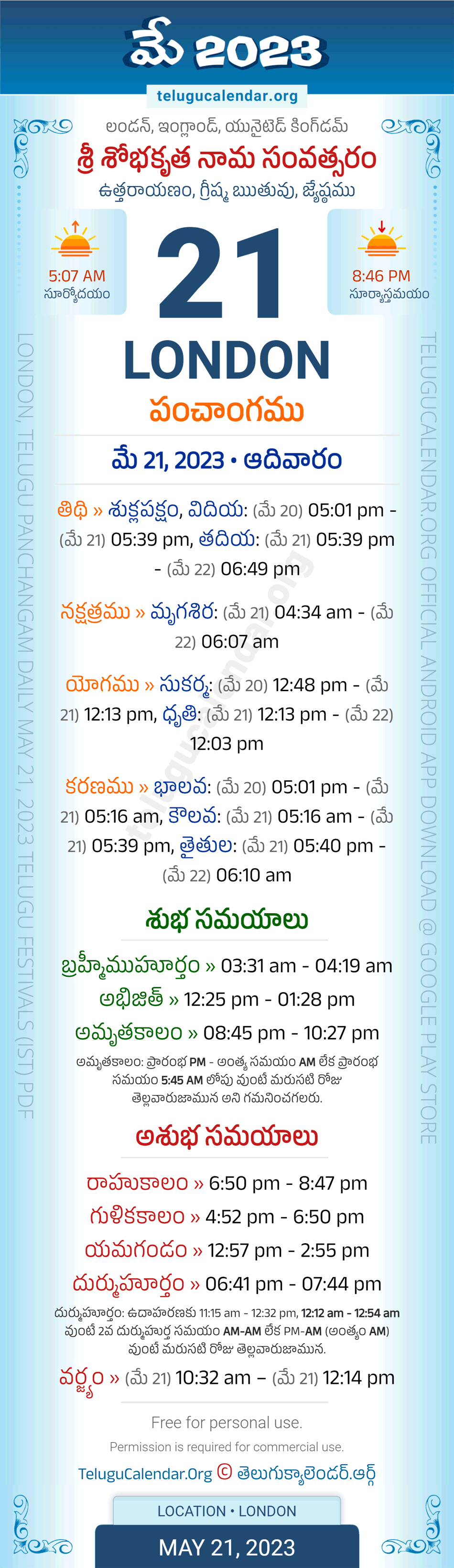 Download » May 21, 2023 » London (UK) Telugu Panchangam Daily Sheet with Auspicious and Inauspicious Timings.
