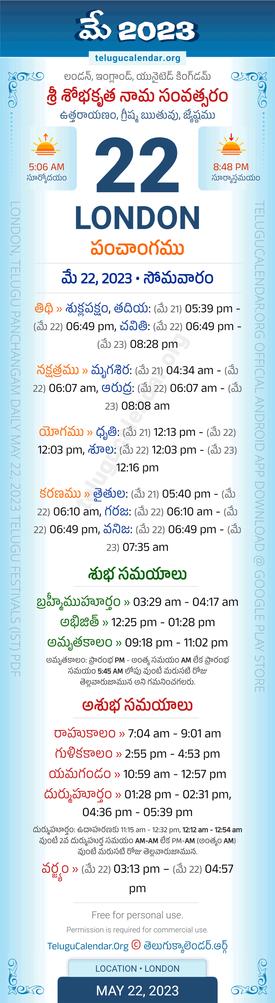 Download » May 22, 2023 » London (UK) Telugu Panchangam Daily Sheet with Auspicious and Inauspicious Timings.