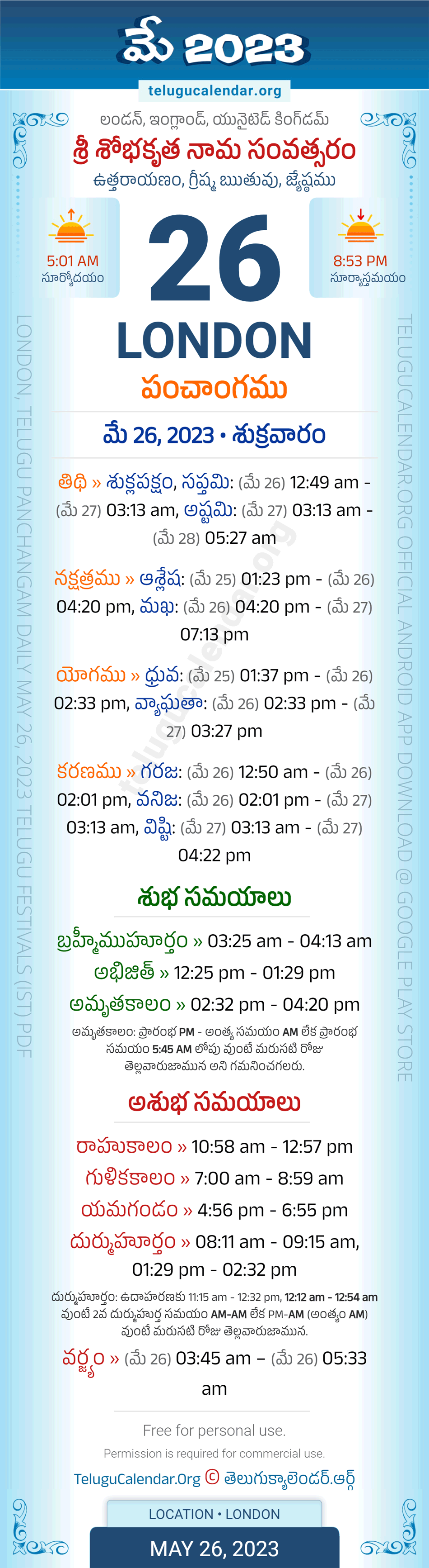 London Panchangam May 26, 2023 Daily Sheet in Telugu... London Telugu Panchangam Friday, May 26, 2023, Today's London Tithi: Sukla Paksham, Saptami: (May 26) 12:49 am - (May 27) 03:13 am, Ashtami: (May 27) 03:13 am - (May 28) 05:27 am, Today's London Nakshatram: Ashlesha: (May 25) 01:23 pm - (May 26) 04:20 pm, Makha: (May 26) 04:20 pm - (May 27) 07:13 pm, Telugu Year: Sri Sobhakritu Nama Samvatsaram, Vedic Aayana: Uttarayanam, Vedic Rutuvu: Grishma, Chandramasa (Amanta): Jyeshtamu. Below image showing information about the 5 attributes of the day, viz., Varam, Tithi, Nakshatram, Yogam & Karanam along with starting and end timings. Read more