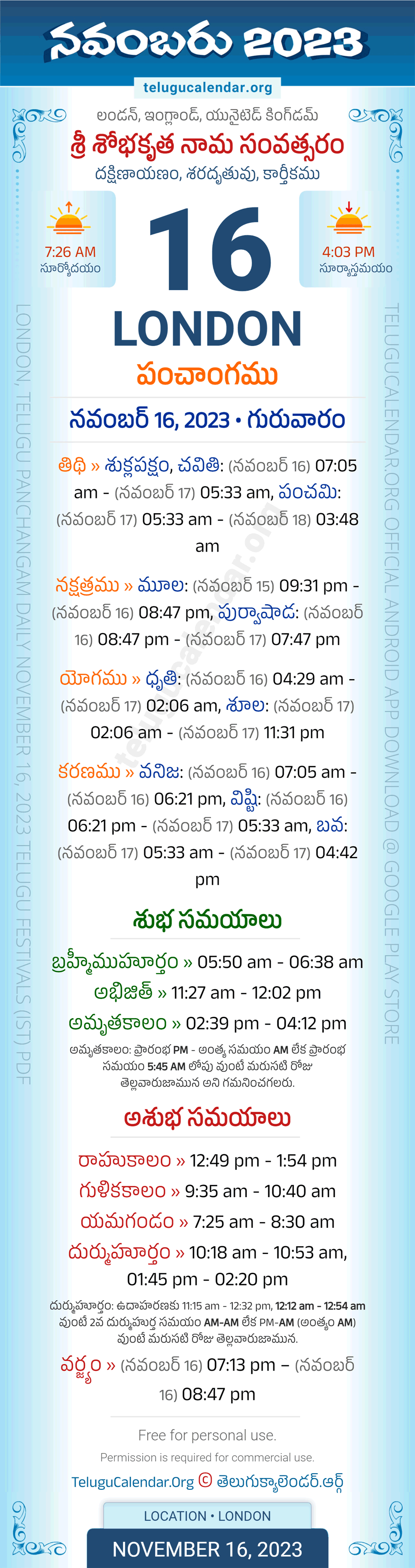 London Panchangam November 16, 2023 Daily Sheet in Telugu... London Telugu Panchangam Thursday, November 16, 2023, Today's London Tithi: Sukla Paksham, Chavithi: (Nov 16) 07:05 am - (Nov 17) 05:33 am, Panchami: (Nov 17) 05:33 am - (Nov 18) 03:48 am, Today's London Nakshatram: Moola: (Nov 15) 09:31 pm - (Nov 16) 08:47 pm, Purva Ashadha: (Nov 16) 08:47 pm - (Nov 17) 07:47 pm, Telugu Year: Sri Sobhakritu Nama Samvatsaram, Vedic Aayana: Dakshinayanam, Vedic Rutuvu: Sharad, Chandramasa (Amanta): Kartikamu. Below image showing information about the 5 attributes of the day, viz., Varam, Tithi, Nakshatram, Yogam & Karanam along with starting and end timings. Read more