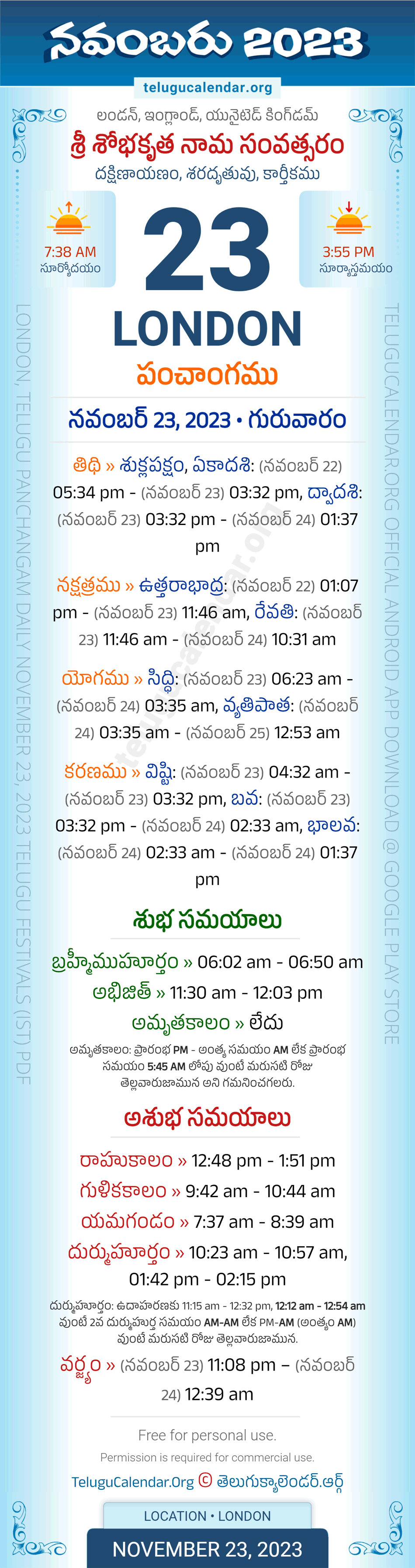 London Panchangam November 23, 2023 Daily Sheet in Telugu... London Telugu Panchangam Thursday, November 23, 2023, Today's London Tithi: Sukla Paksham, Ekadashi: (Nov 22) 05:34 pm - (Nov 23) 03:32 pm, Dwadasi: (Nov 23) 03:32 pm - (Nov 24) 01:37 pm, Today's London Nakshatram: Uttara Bhadrapada: (Nov 22) 01:07 pm - (Nov 23) 11:46 am, Revathi: (Nov 23) 11:46 am - (Nov 24) 10:31 am, Telugu Year: Sri Sobhakritu Nama Samvatsaram, Vedic Aayana: Dakshinayanam, Vedic Rutuvu: Sharad, Chandramasa (Amanta): Kartikamu. Below image showing information about the 5 attributes of the day, viz., Varam, Tithi, Nakshatram, Yogam & Karanam along with starting and end timings. Read more