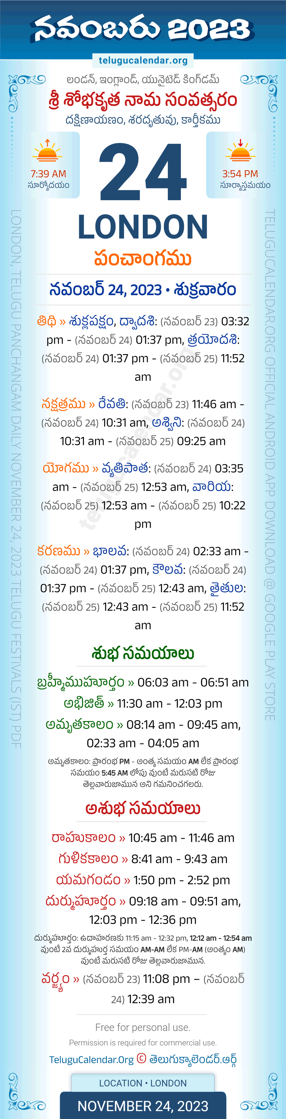 Download » November 24, 2023 » London (UK) Telugu Panchangam Daily Sheet with Auspicious and Inauspicious Timings.