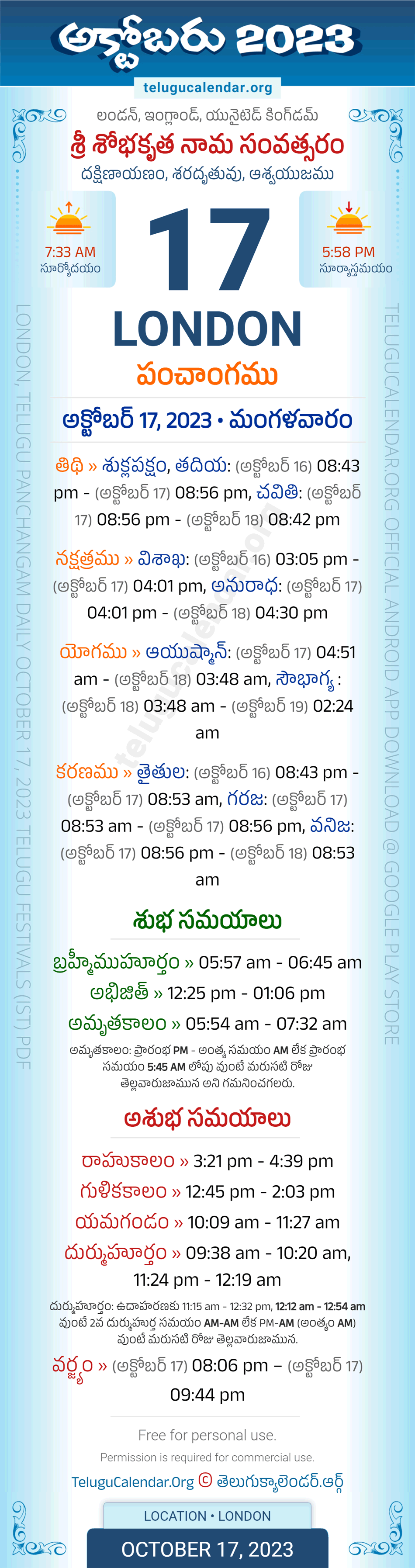 Download » October 17, 2023 » London (UK) Telugu Panchangam Daily Sheet with Auspicious and Inauspicious Timings.