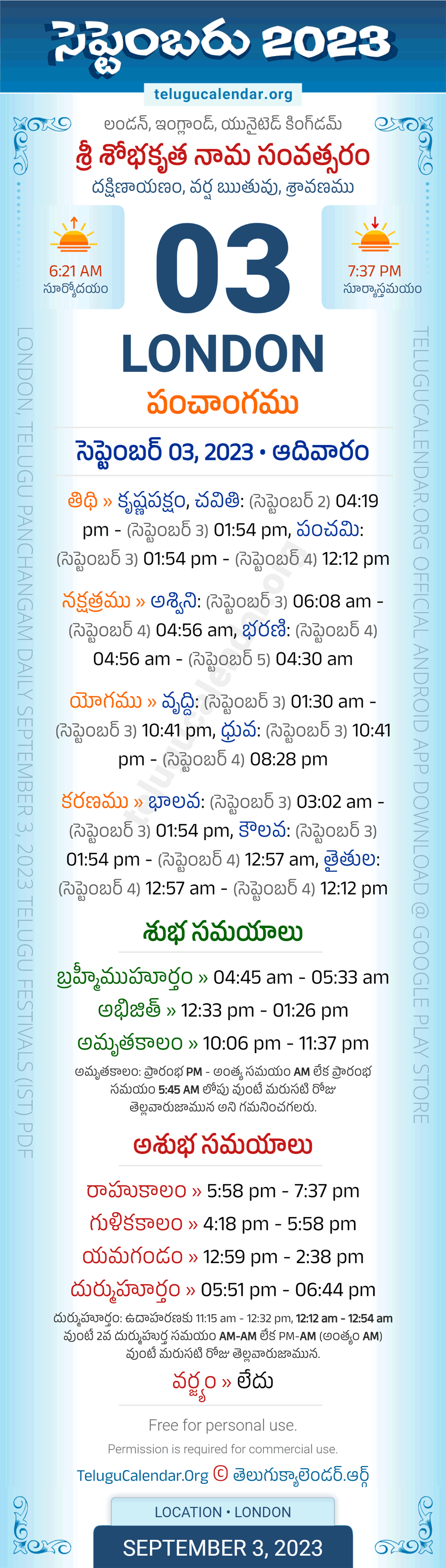 London Panchangam September 3, 2023 Daily Sheet in Telugu... London Telugu Panchangam Sunday, September 03, 2023, Today's London Tithi: Krishna Paksham, Chavithi: (Sep 2) 04:19 pm - (Sep 3) 01:54 pm, Panchami: (Sep 3) 01:54 pm - (Sep 4) 12:12 pm, Today's London Nakshatram: Aswini: (Sep 3) 06:08 am - (Sep 4) 04:56 am, Bharani: (Sep 4) 04:56 am - (Sep 5) 04:30 am, Telugu Year: Sri Sobhakritu Nama Samvatsaram, Vedic Aayana: Dakshinayanam, Vedic Rutuvu: Varsha, Chandramasa (Amanta): Sravanamu. Below image showing information about the 5 attributes of the day, viz., Varam, Tithi, Nakshatram, Yogam & Karanam along with starting and end timings. Read more