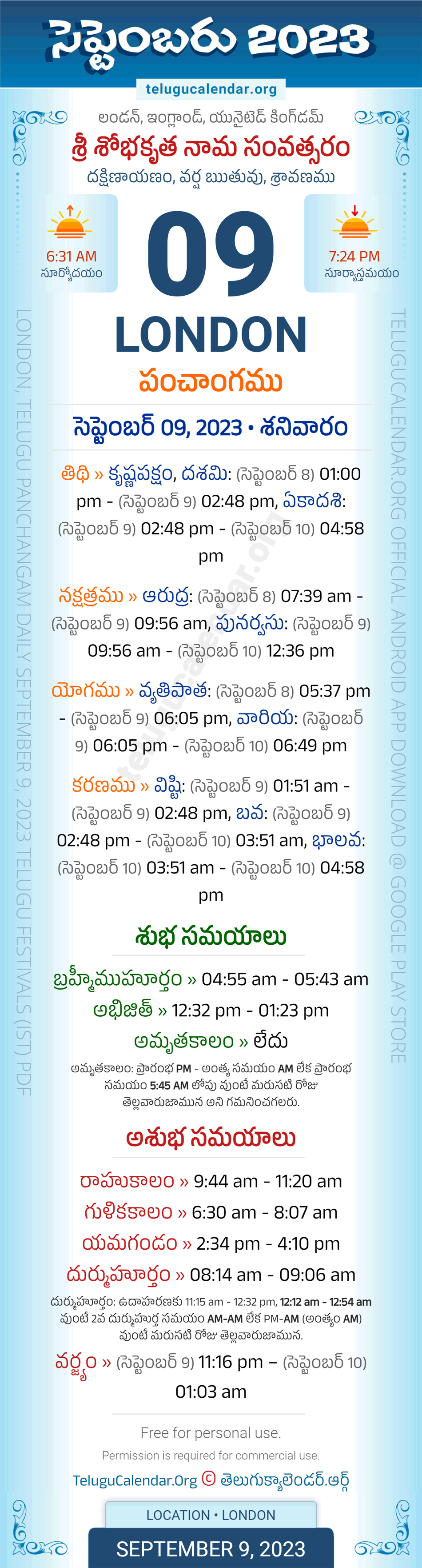 London Panchangam September 9, 2023 Daily Sheet in Telugu... London Telugu Panchangam Saturday, September 09, 2023, Today's London Tithi: Krishna Paksham, Dashami: (Sep 8) 01:00 pm - (Sep 9) 02:48 pm, Ekadashi: (Sep 9) 02:48 pm - (Sep 10) 04:58 pm, Today's London Nakshatram: Arudra: (Sep 8) 07:39 am - (Sep 9) 09:56 am, Punarvasu: (Sep 9) 09:56 am - (Sep 10) 12:36 pm, Telugu Year: Sri Sobhakritu Nama Samvatsaram, Vedic Aayana: Dakshinayanam, Vedic Rutuvu: Varsha, Chandramasa (Amanta): Sravanamu. Below image showing information about the 5 attributes of the day, viz., Varam, Tithi, Nakshatram, Yogam & Karanam along with starting and end timings. Read more