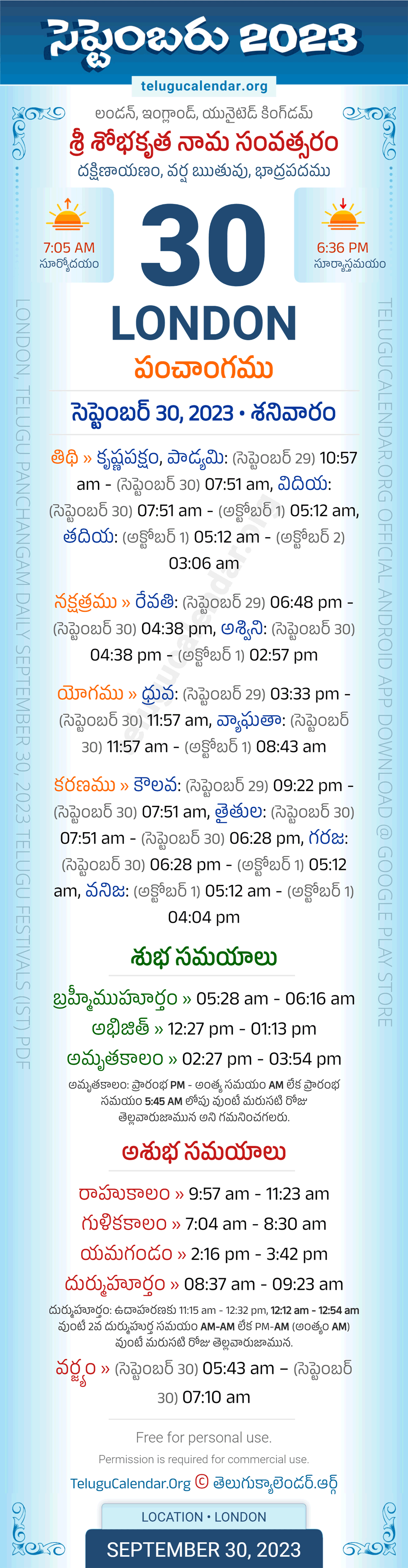 Download » September 30, 2023 » London (UK) Telugu Panchangam Daily Sheet with Auspicious and Inauspicious Timings.
