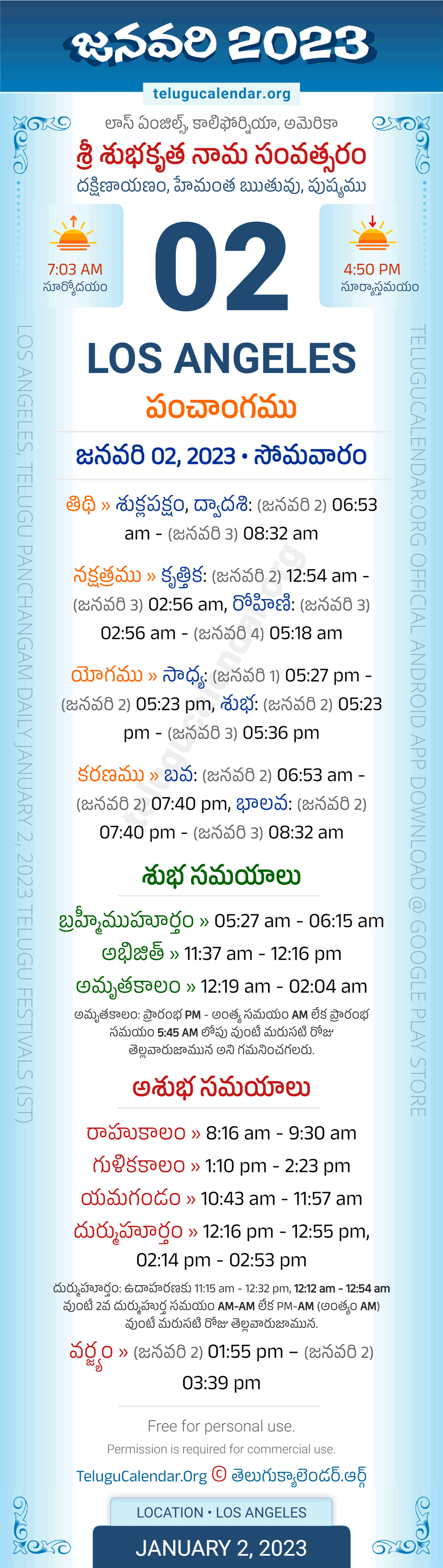 Download » January 2, 2023 » Los Angeles (USA) Telugu Panchangam Daily Sheet with Auspicious and Inauspicious Timings.