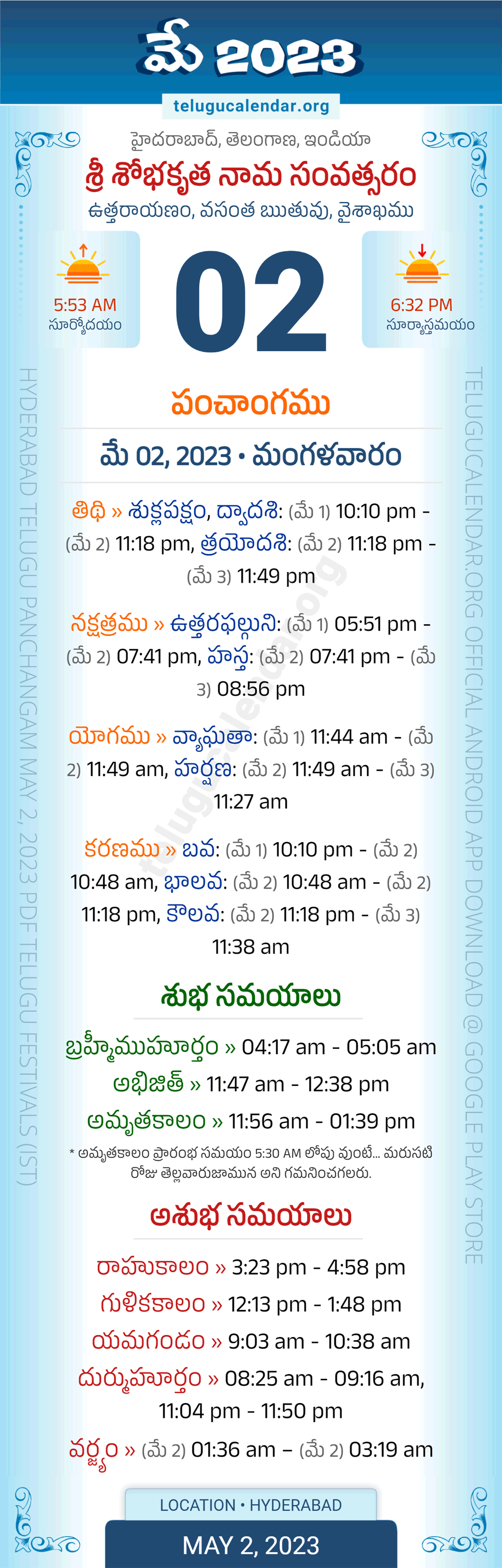 Apart from the Panchangam 2023 Daily, you can also find the Sunrise and Sunset (Middle Limb) timings, Paksham, Telugu Year, Yanam, Rutuvu, Telugu Month for Hyderabad. Auspicious Period May 2, 2023 for Hyderabad. Shubha Muhuratam (Today Good Timings like Abhijit Muhurtham, Amruta Kalam & Brahma Muhurtham) and Inauspicious Period May 2, 2023 for Hyderabad (Bad Timings like Durmuhurtham, Varjyam, Rahukalam, Gulika kalam & Yamagandam) with starting and end timings in the above image in Telugu Language.