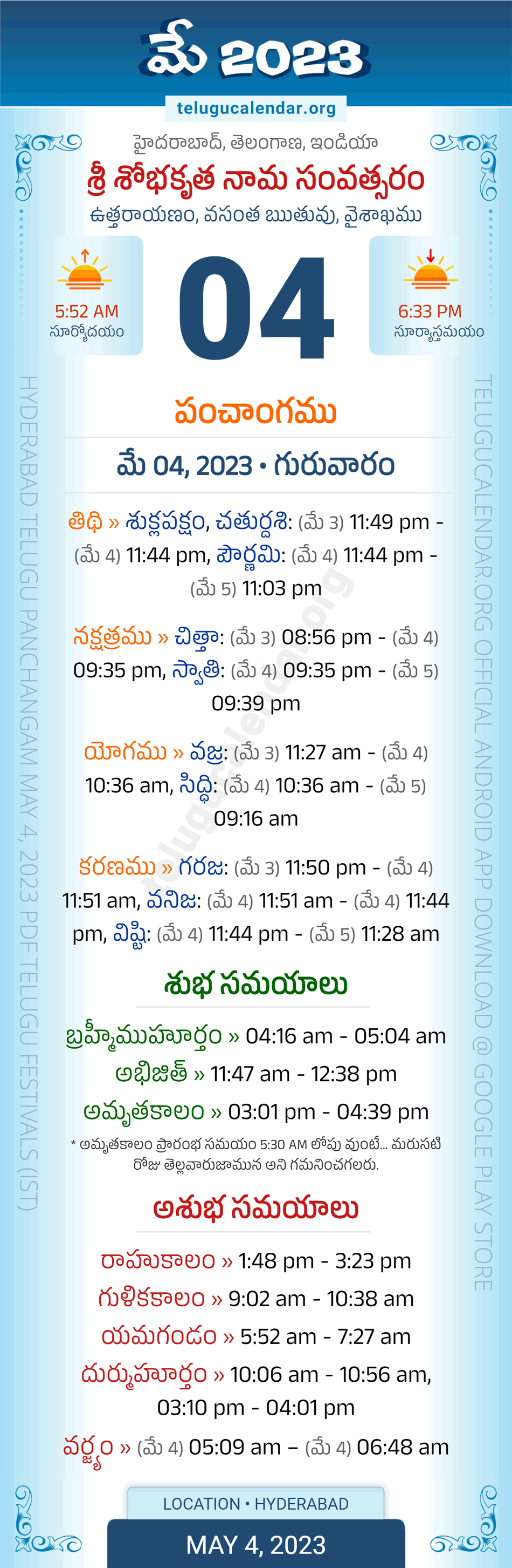 Download » May 4, 2023 » Hyderabad, Telangana Telugu Calendar Panchangam Daily Sheet with Auspicious and Inauspicious Timings.