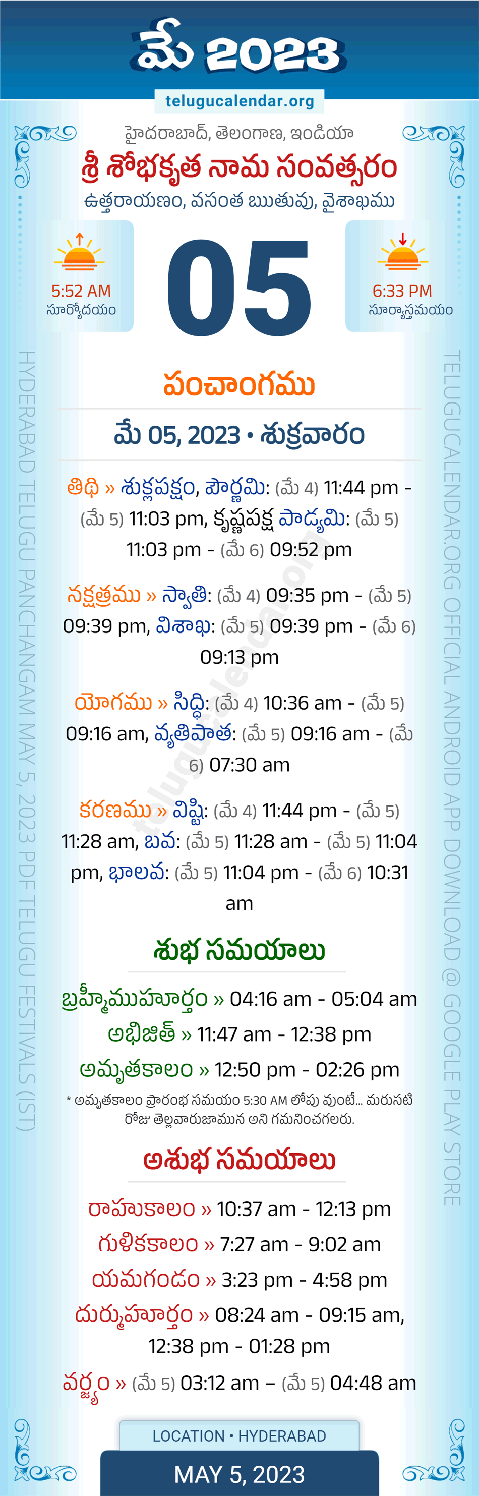 Download » May 5, 2023 » Hyderabad, Telangana Telugu Calendar Panchangam Daily Sheet with Auspicious and Inauspicious Timings.