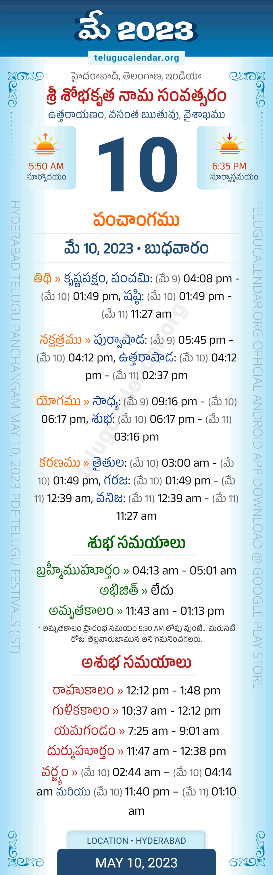 Download » May 10, 2023 » Hyderabad, Telangana Telugu Calendar Panchangam Daily Sheet with Auspicious and Inauspicious Timings.