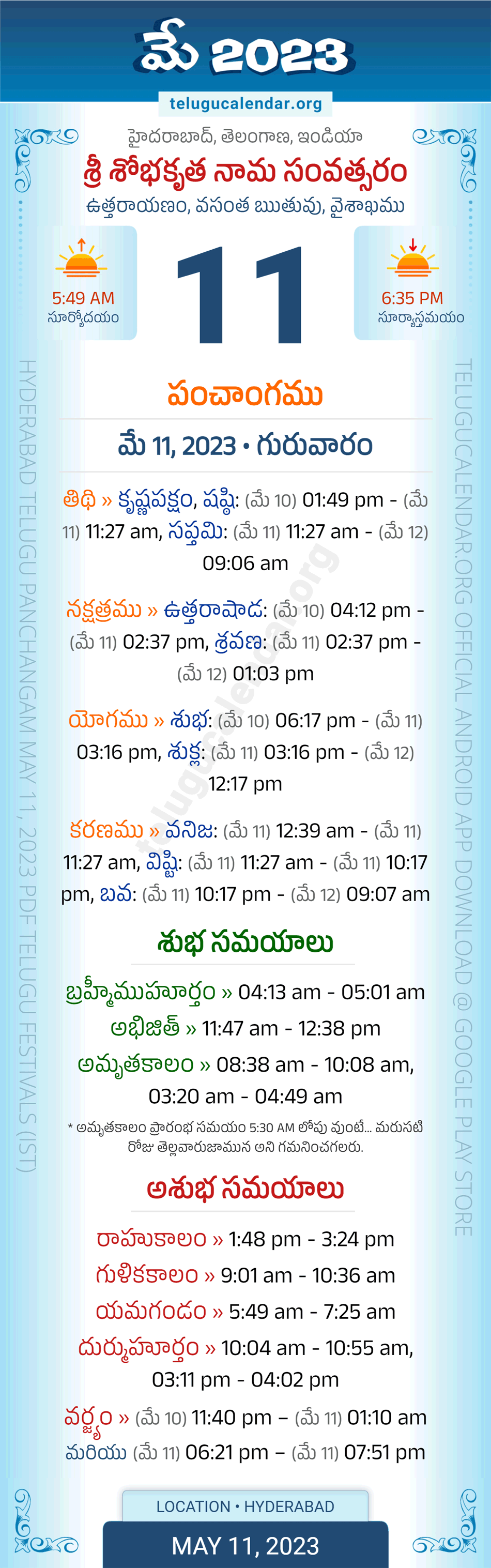 Download » May 11, 2023 » Hyderabad, Telangana Telugu Calendar Panchangam Daily Sheet with Auspicious and Inauspicious Timings.