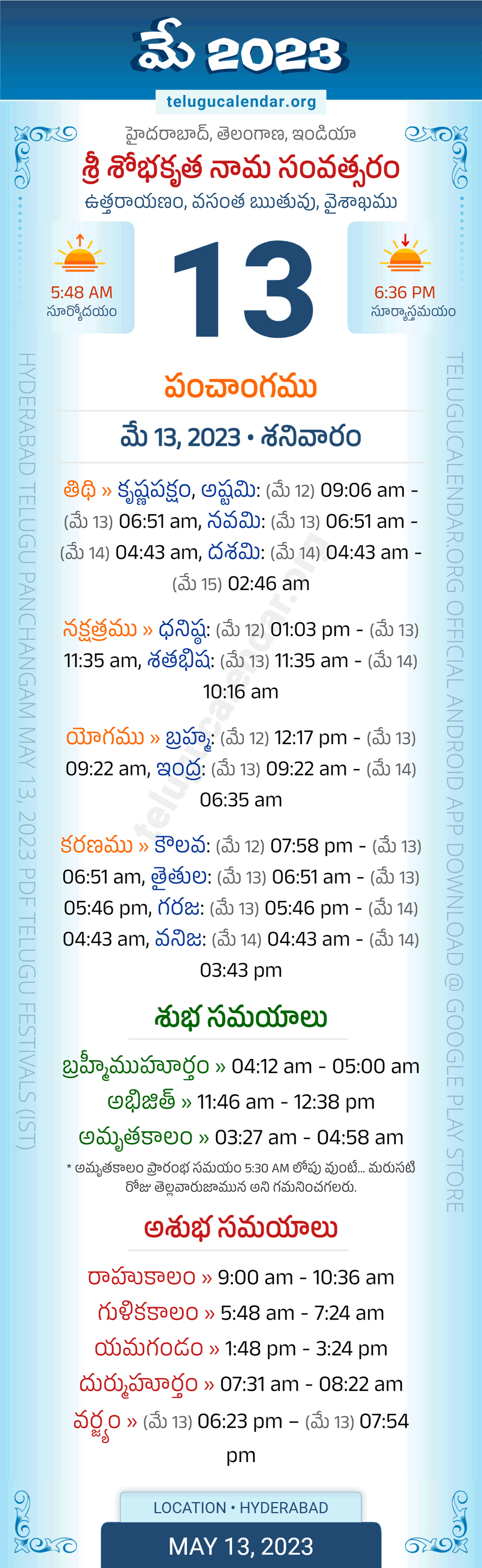 Panchangam May 13, 2023 Telugu Calendar Daily Sheet for Hyderabad (Telangana)... Amavasya Date in May 2023 and Pournami Date in May 2023. Today Telugu Panchangam Date: Saturday, May 13, 2023, Today Tithi: Krishna Paksham, Ashtami: (May 12) 09:06 am - (May 13) 06:51 am, Navami: (May 13) 06:51 am - (May 14) 04:43 am, Dashami: (May 14) 04:43 am - (May 15) 02:46 am, Today Nakshatram: Dhanishta: (May 12) 01:03 pm - (May 13) 11:35 am, Shathabhisha: (May 13) 11:35 am - (May 14) 10:16 am, Telugu Year: Sri Sobhakritu Nama Samvatsaram, Vedic Aayana: Uttarayanam, Vedic Rutuvu: Vasanta, Chandramasa (Amanta): Vaisakhamu. Below image showing information about the 5 attributes of the day, viz., Varam, Tithi, Nakshatram, Yogam & Karanam along with starting and end timings. Read more