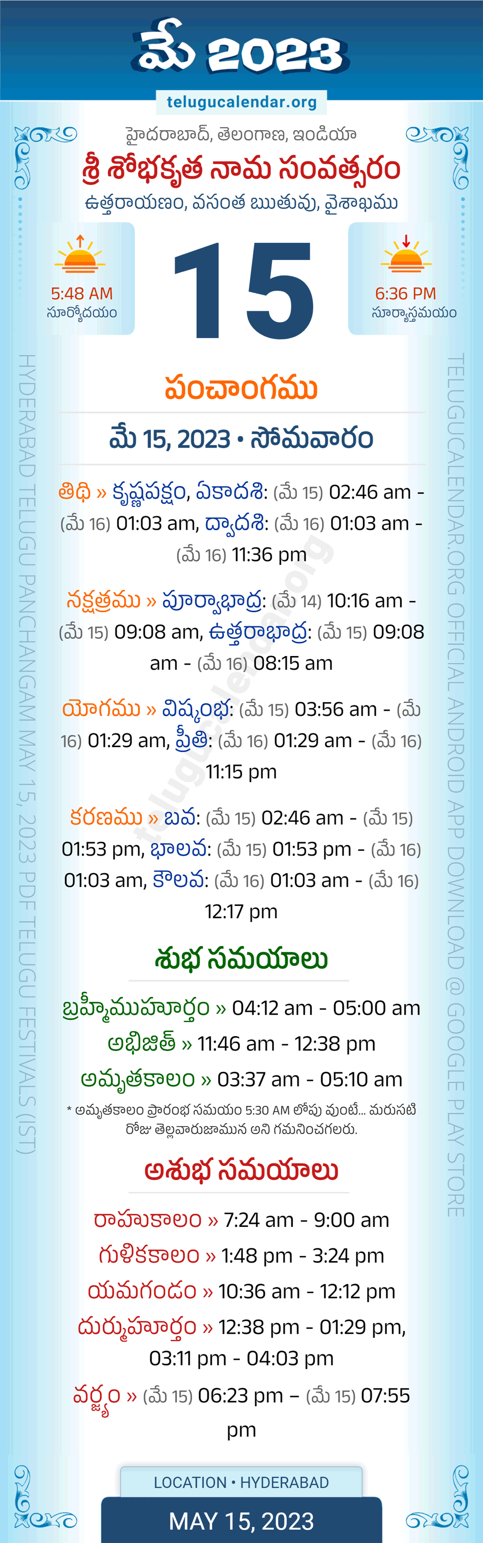 Download » May 15, 2023 » Hyderabad, Telangana Telugu Calendar Panchangam Daily Sheet with Auspicious and Inauspicious Timings.