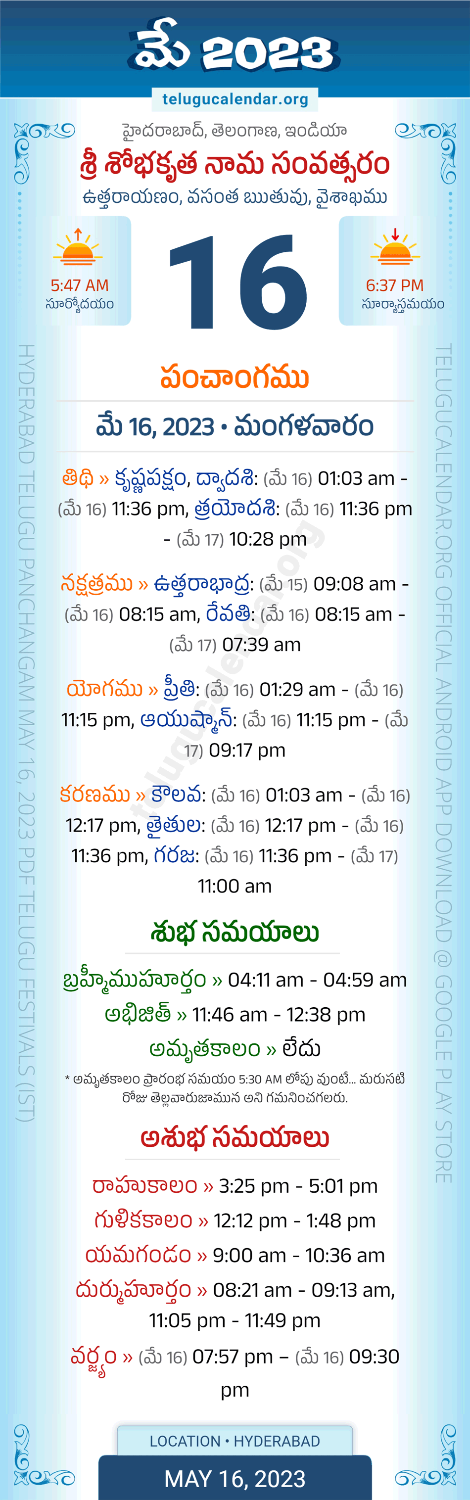Download » May 16, 2023 » Hyderabad, Telangana Telugu Calendar Panchangam Daily Sheet with Auspicious and Inauspicious Timings.