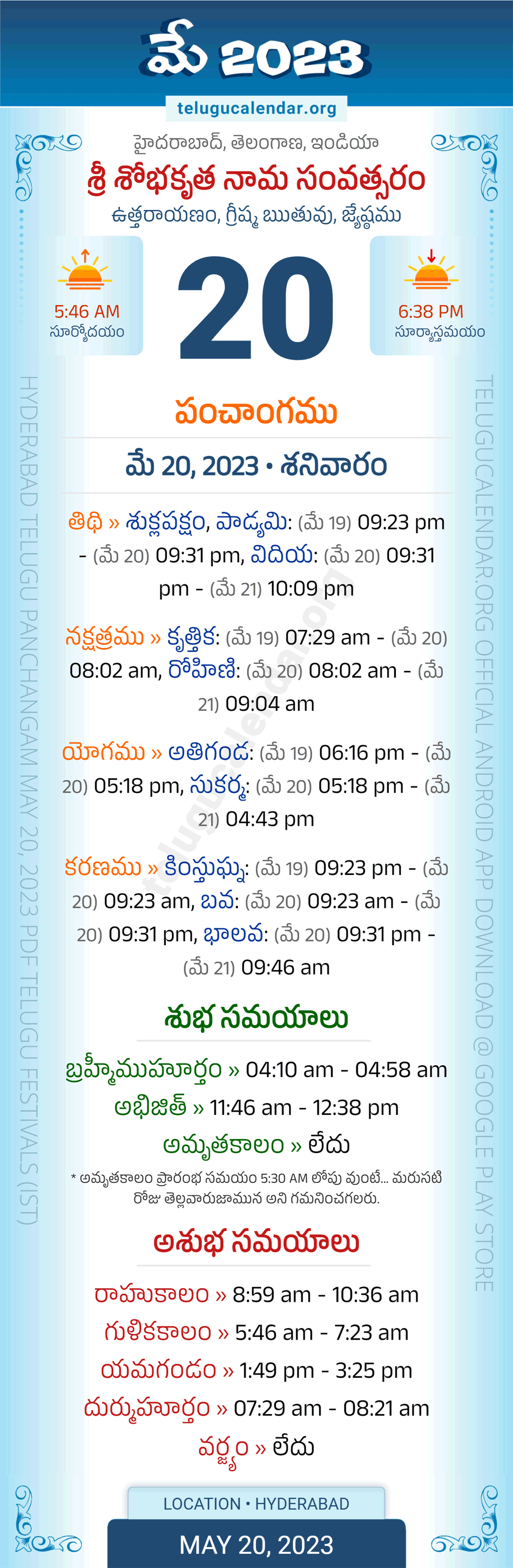 Download » May 20, 2023 » Hyderabad, Telangana Telugu Calendar Panchangam Daily Sheet with Auspicious and Inauspicious Timings.