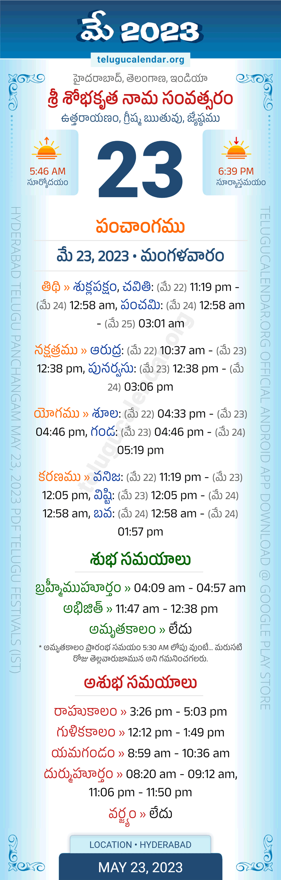 Download » May 23, 2023 » Hyderabad, Telangana Telugu Calendar Panchangam Daily Sheet with Auspicious and Inauspicious Timings.