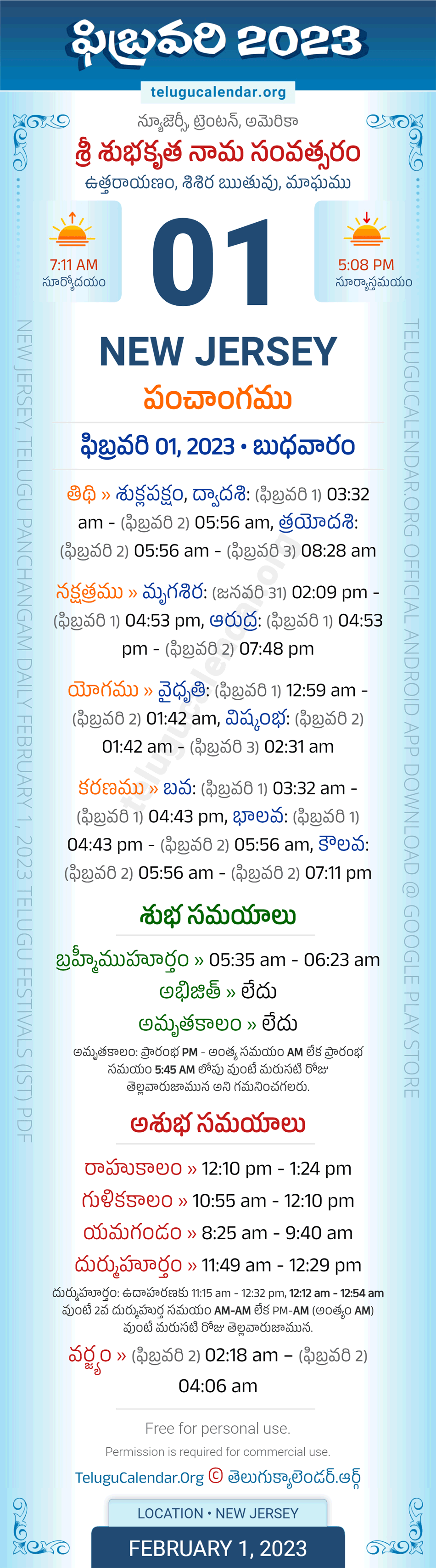 Download » February 1, 2023 » New Jersey (USA) Telugu Panchangam Daily Sheet with Auspicious and Inauspicious Timings.