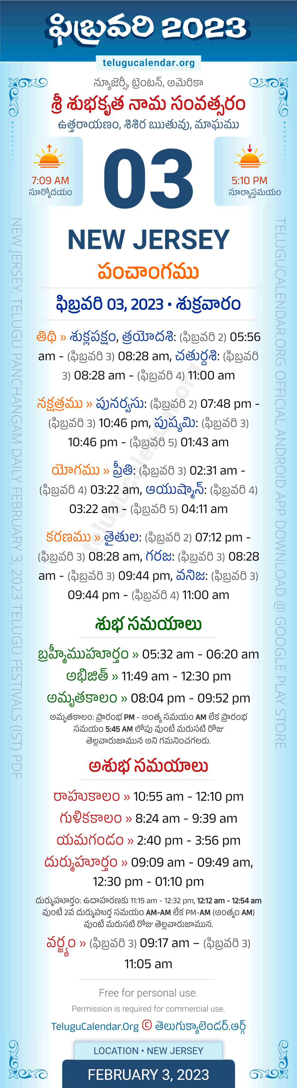 Download » February 3, 2023 » New Jersey (USA) Telugu Panchangam Daily Sheet with Auspicious and Inauspicious Timings.