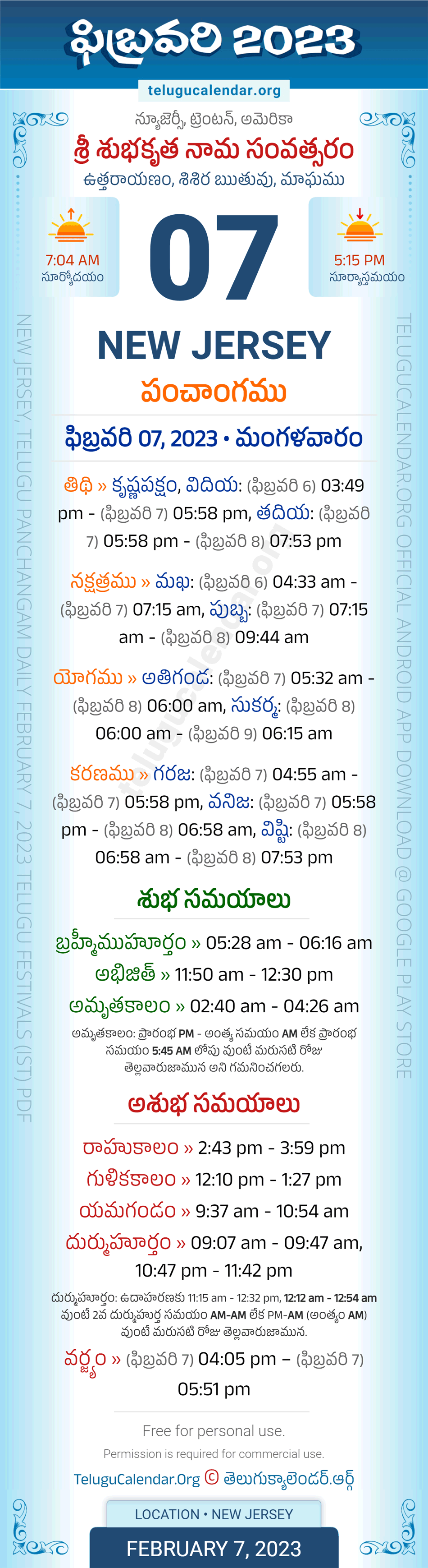 Download » February 7, 2023 » New Jersey (USA) Telugu Panchangam Daily Sheet with Auspicious and Inauspicious Timings.