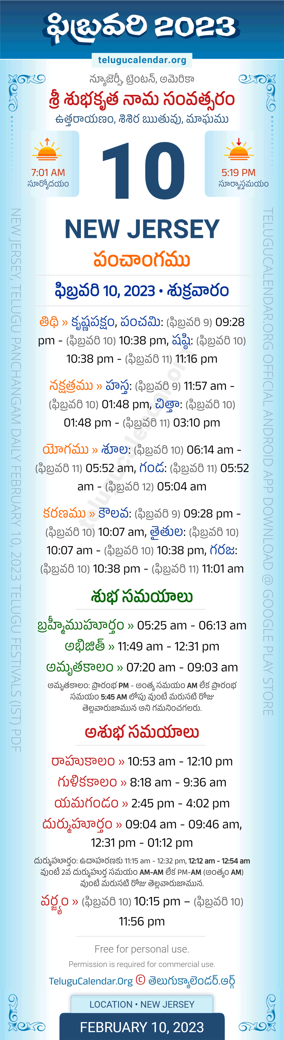Download » February 10, 2023 » New Jersey (USA) Telugu Panchangam Daily Sheet with Auspicious and Inauspicious Timings.