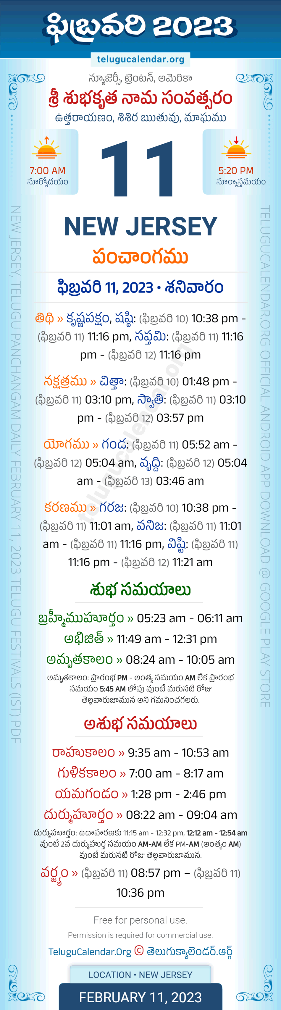 Download » February 11, 2023 » New Jersey (USA) Telugu Panchangam Daily Sheet with Auspicious and Inauspicious Timings.