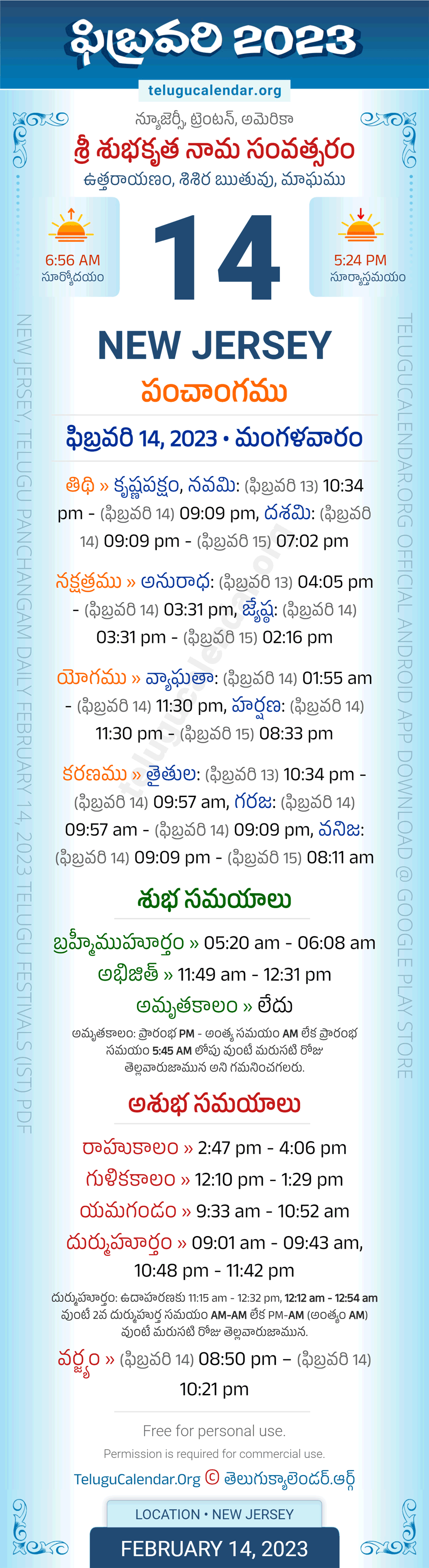 Download » February 14, 2023 » New Jersey (USA) Telugu Panchangam Daily Sheet with Auspicious and Inauspicious Timings.
