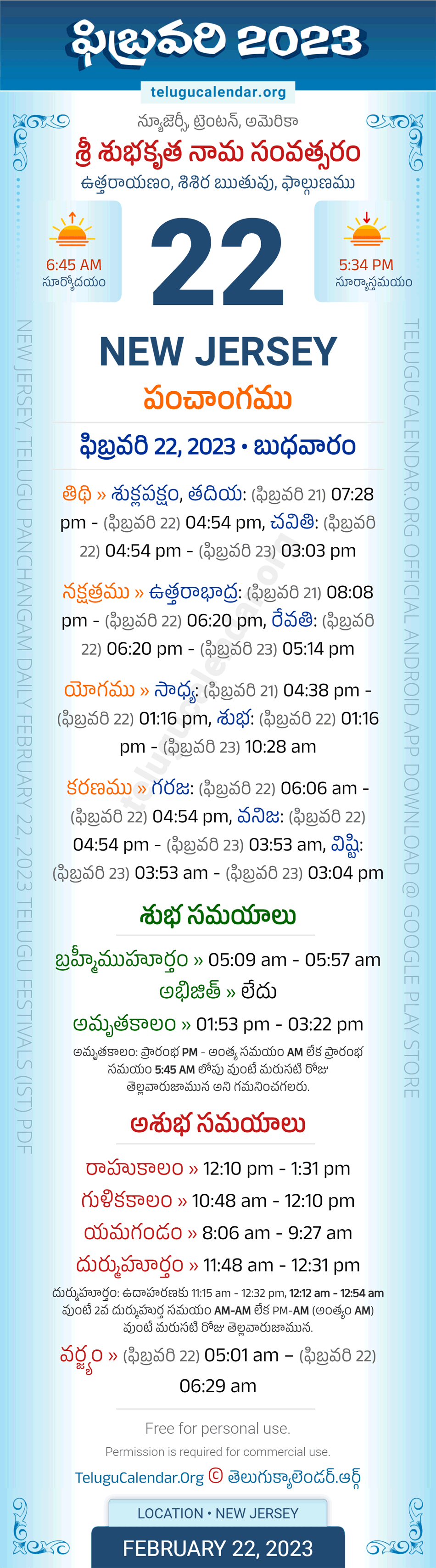 Download » February 22, 2023 » New Jersey (USA) Telugu Panchangam Daily Sheet with Auspicious and Inauspicious Timings.