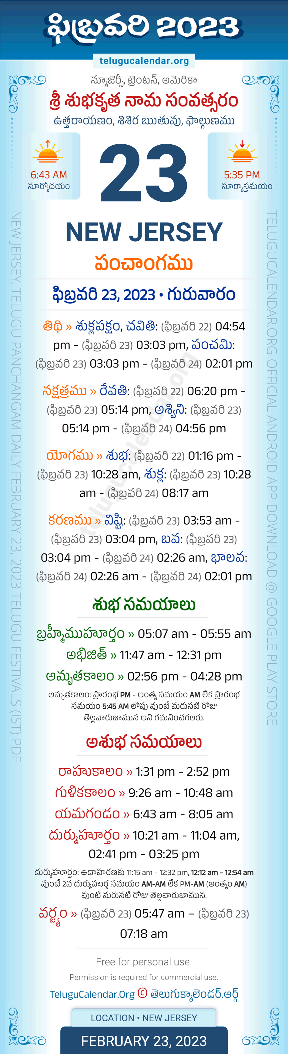 Download » February 23, 2023 » New Jersey (USA) Telugu Panchangam Daily Sheet with Auspicious and Inauspicious Timings.